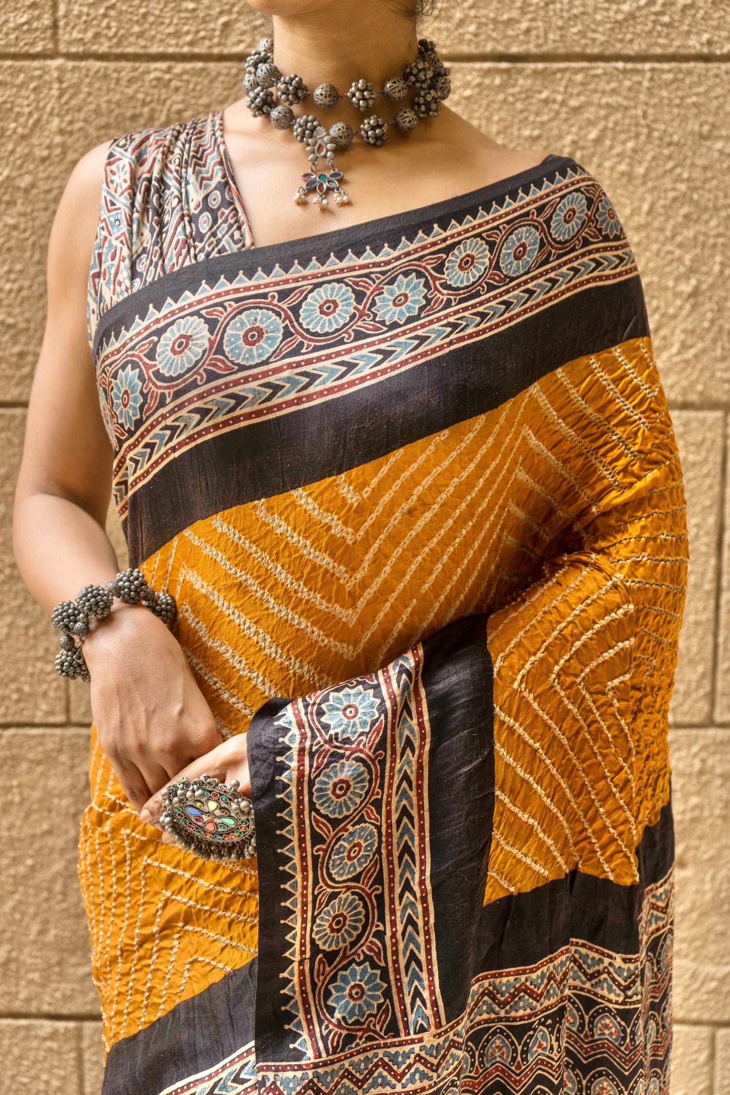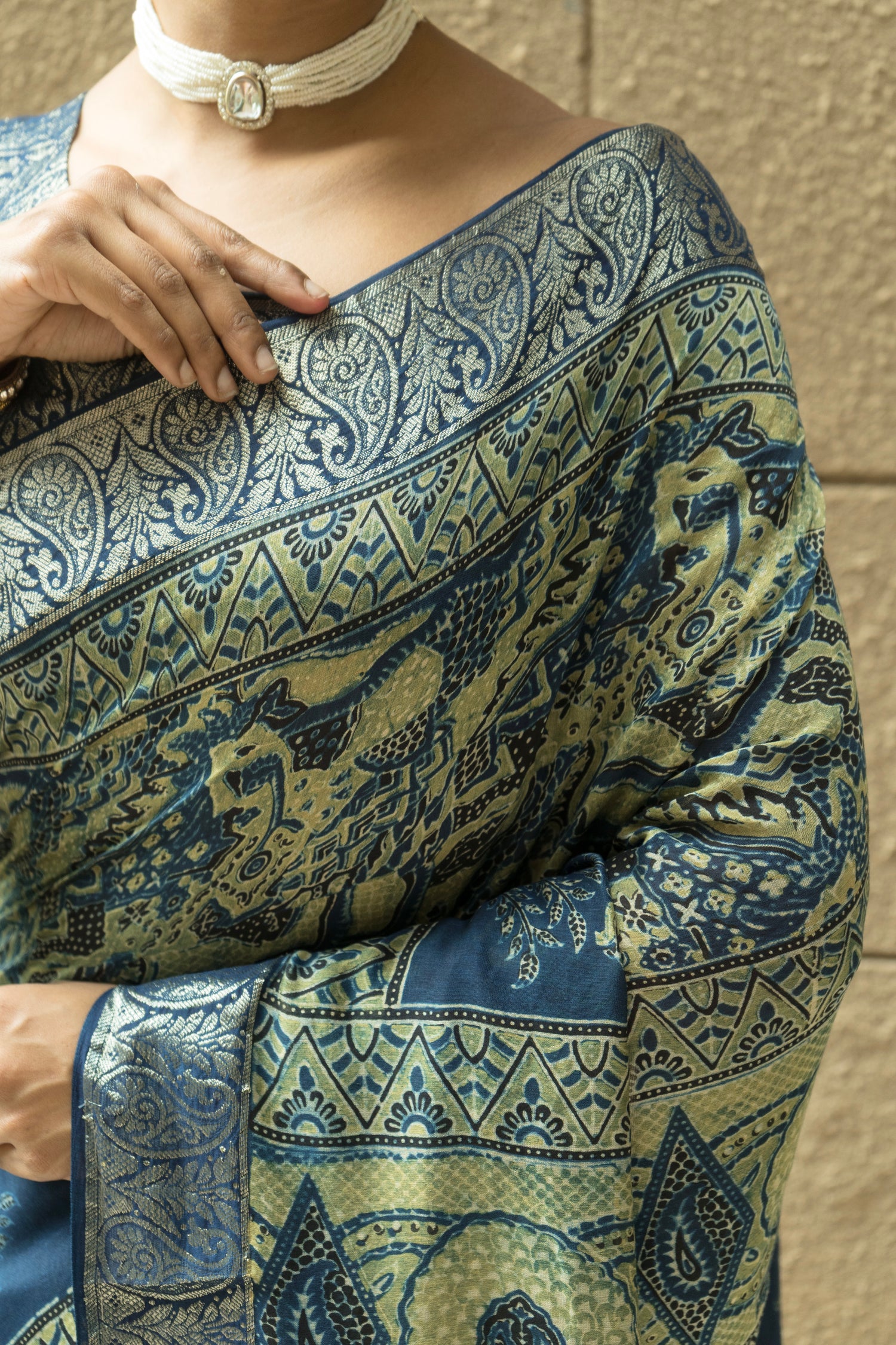 Discover Ajrakh sarees online at Umay Benaras. Explore modal silk & print...