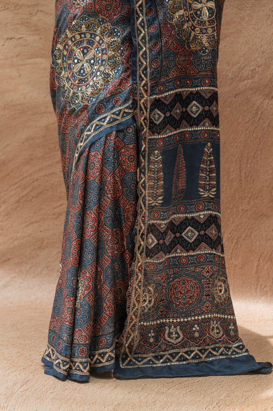 Embroidered Ajrakh Print Indigo Floral Gajji Saree