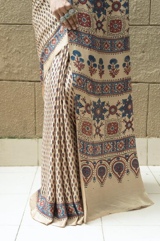 Ajrakh Print Floral Gajji Ivory Gold Saree