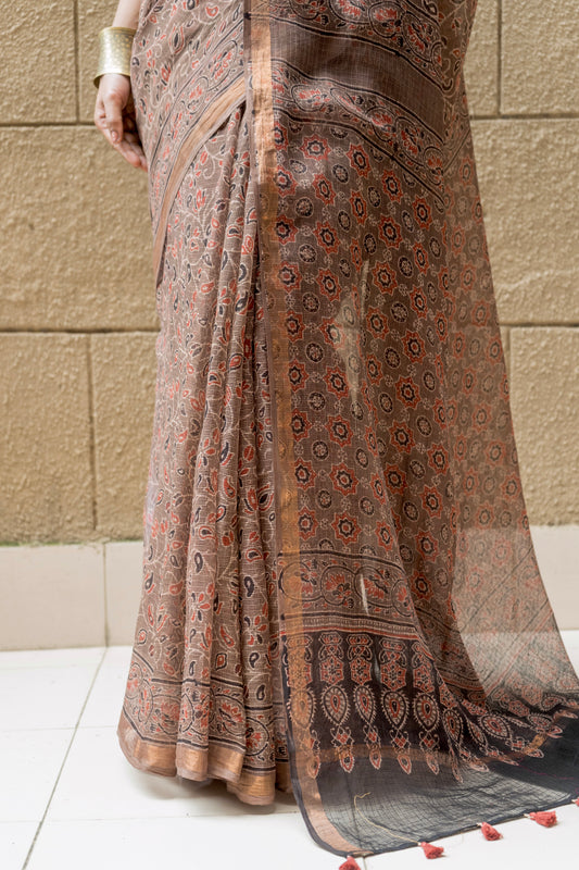 Kota Doria Ajrakh Print Brown Saree
