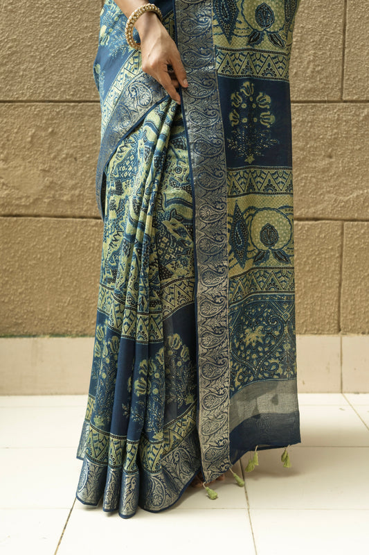 Chanderi Ajrakh Abstract Print with Zari Borders Indigo Saree