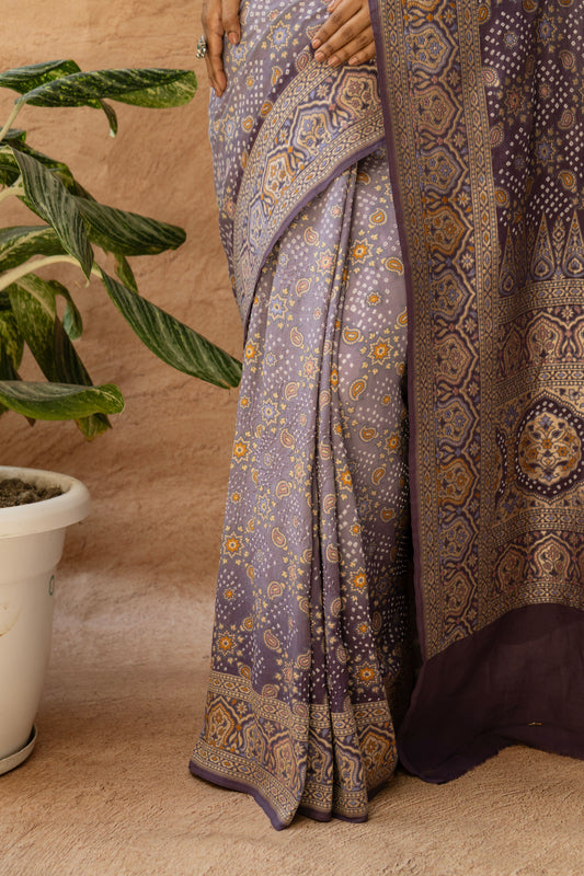 Ajrakh Weaving Purple Ombre Rai Dana Bandhej Saree