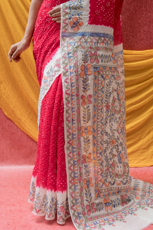 Moonga Madhubani Bandhej Red Saree