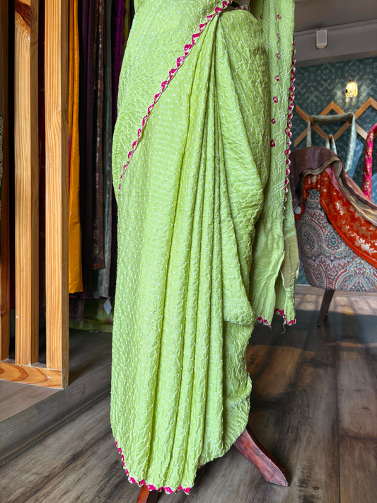 Gajji Pink Rai Dana Pista Green Bandhej Saree