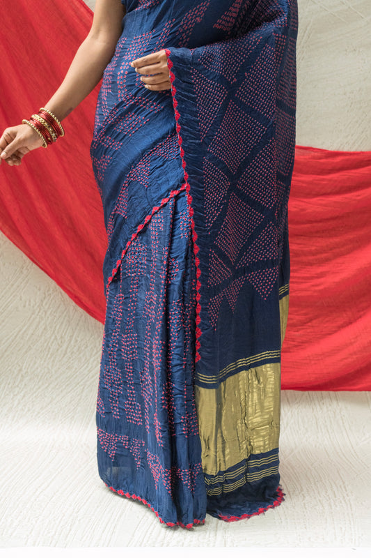 Gajji Red Rai Dana Blue Bandhej Saree