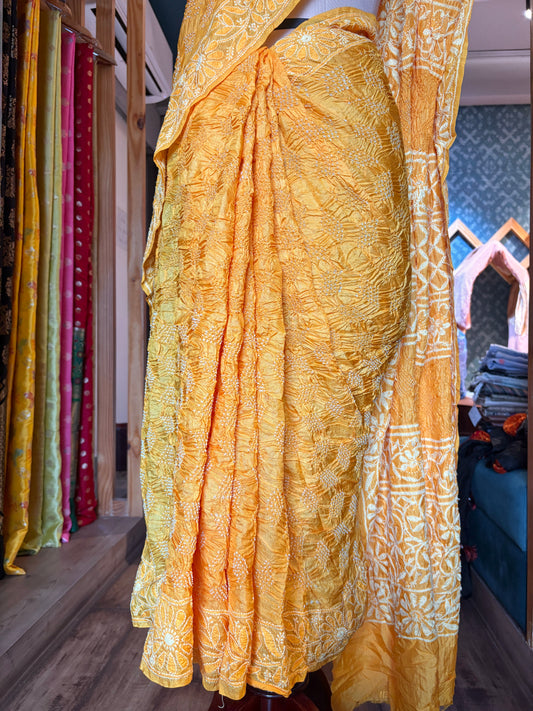 Tussar Lucknowi Rai Dana Yellow Bandhej Saree