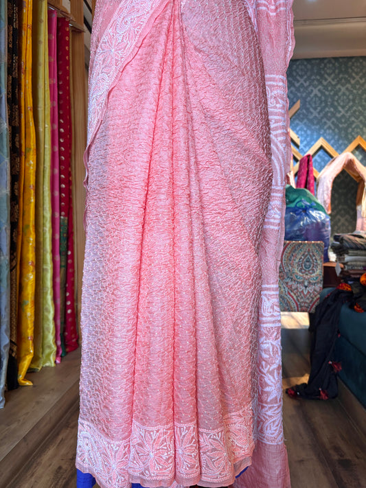 Tussar Lucknowi Rai Dana Pastel Pink Bandhej Saree