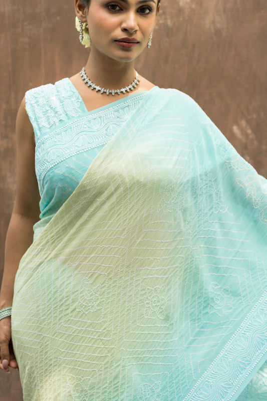 Lucknowi Georgette Ombre Blue-Green Bandhej Saree