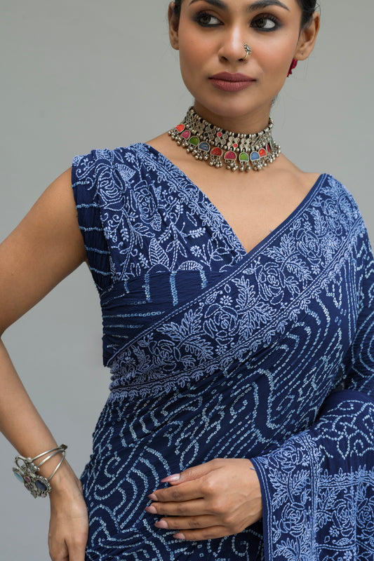 Georgette Lucknowi Rai Dana Royal Blue Bandhej Saree