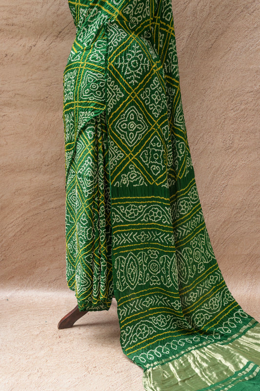 Gajji Pink Rai Dana Pista Green Bandhej Saree