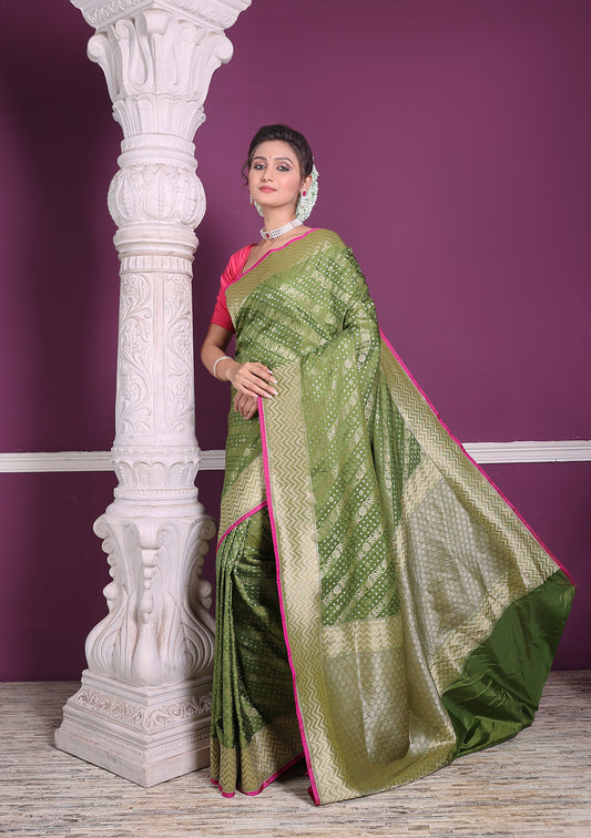 Mehendi Green Katan Leheriya Silver Gold Zari Saree