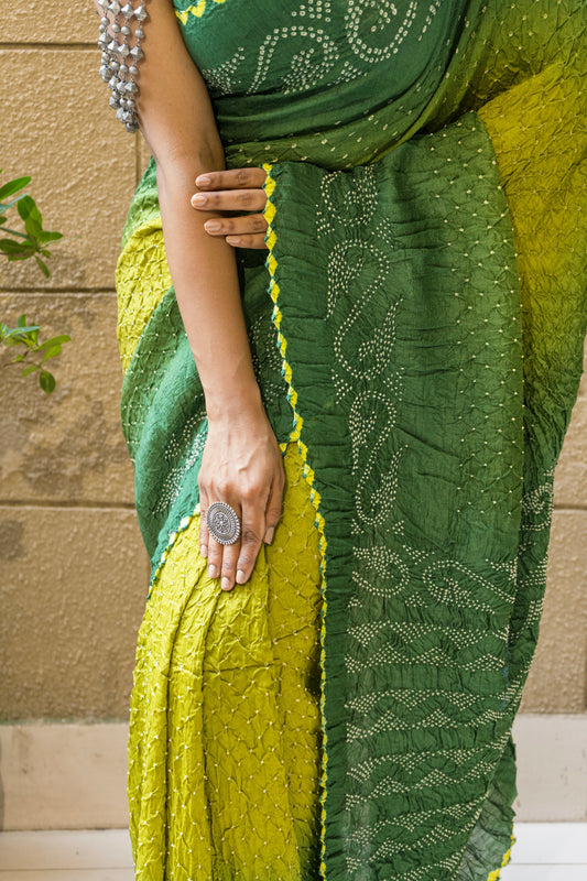 Moonga Rai Dana Bandhej Shaded Green Saree