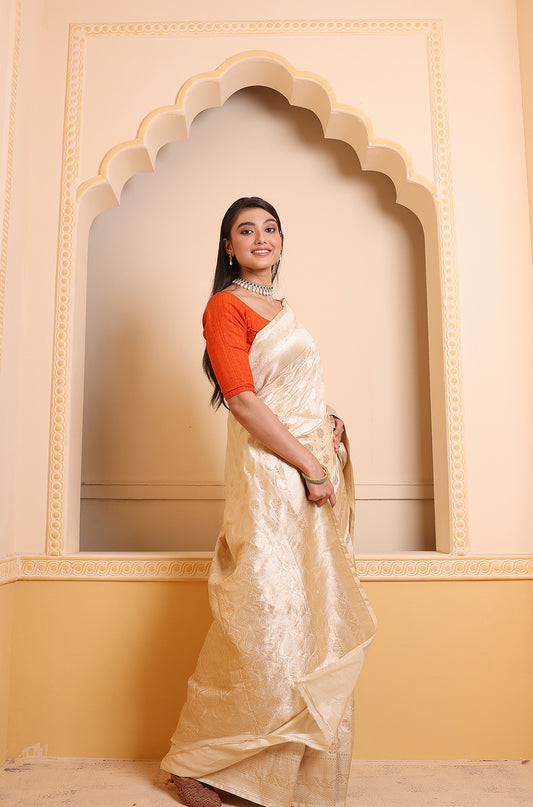Cream Katan Booti Upada Saree