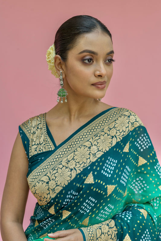Lucknowi Georgette Ombre Blue-Green Bandhej Saree