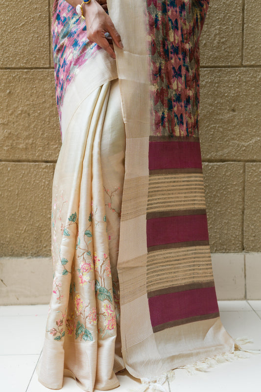 Tussar Katha Zig-Zag Bluish Grey Saree