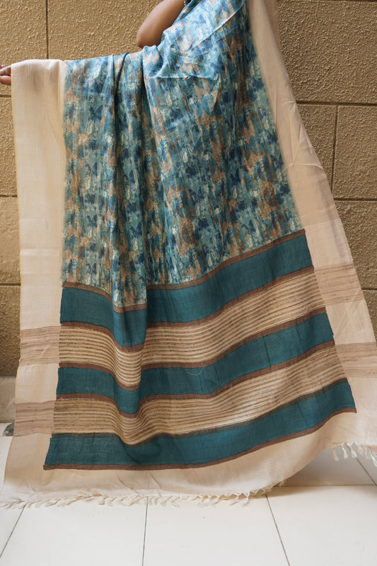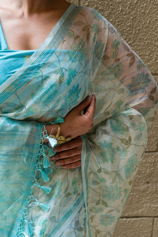 Linen Floral Printed Zari Stripes Aasmani Saree