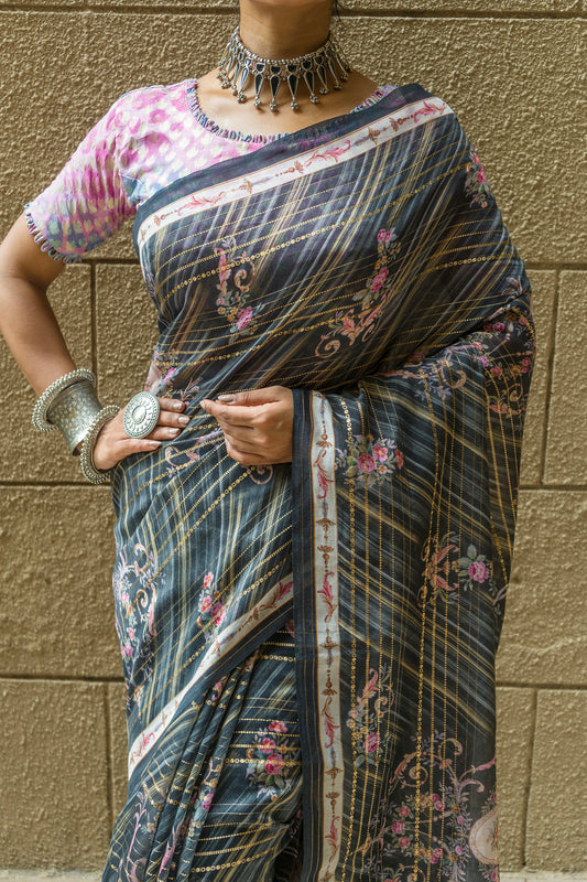 Chanderi Floral Printed Zari Stripes (Black) Saree