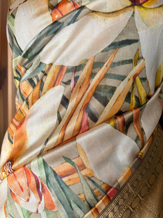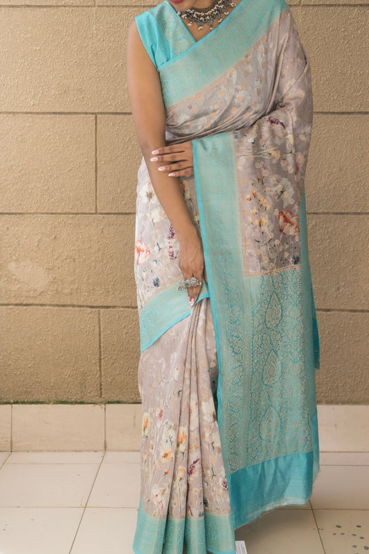 Chiniya Blue-Grey Floral (Golden Booti) Saree