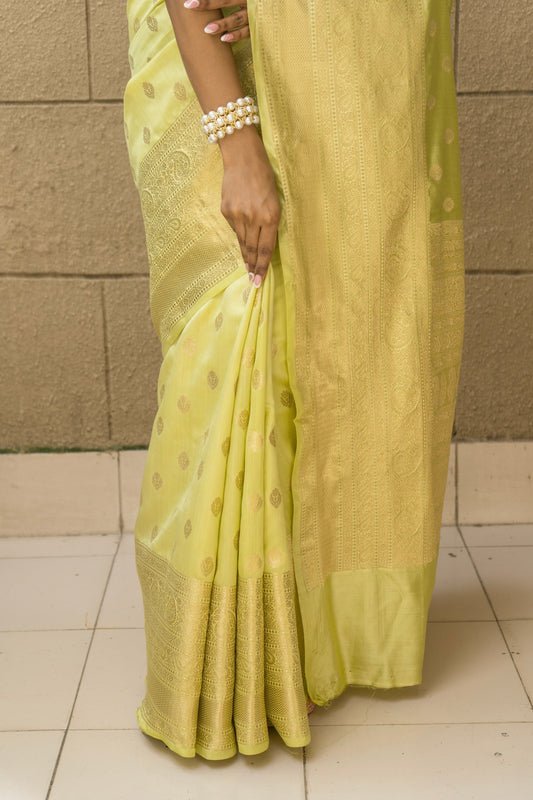 Rangkat Yellow-Peach Chiniya Leheriya Saree