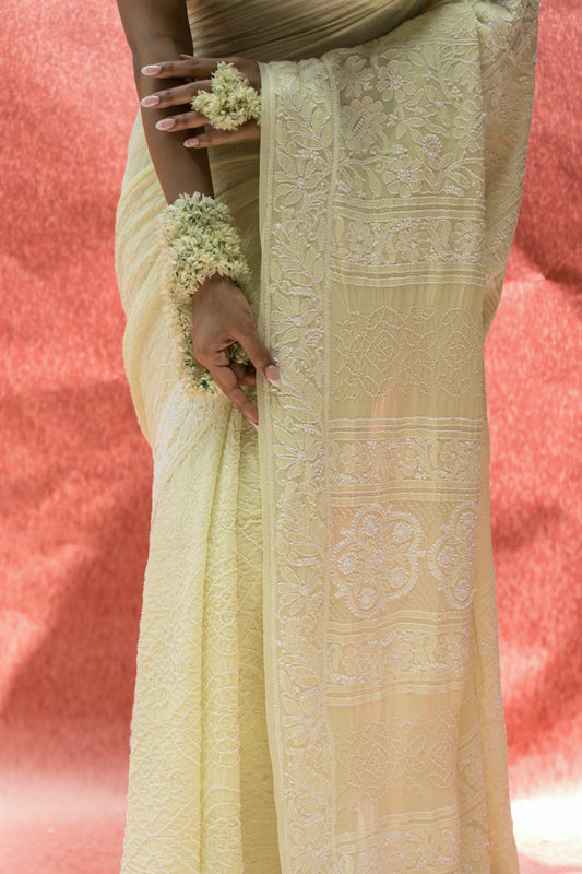 Lucknowi Georgette Rai Dana (Mint Green) Bandhej Saree