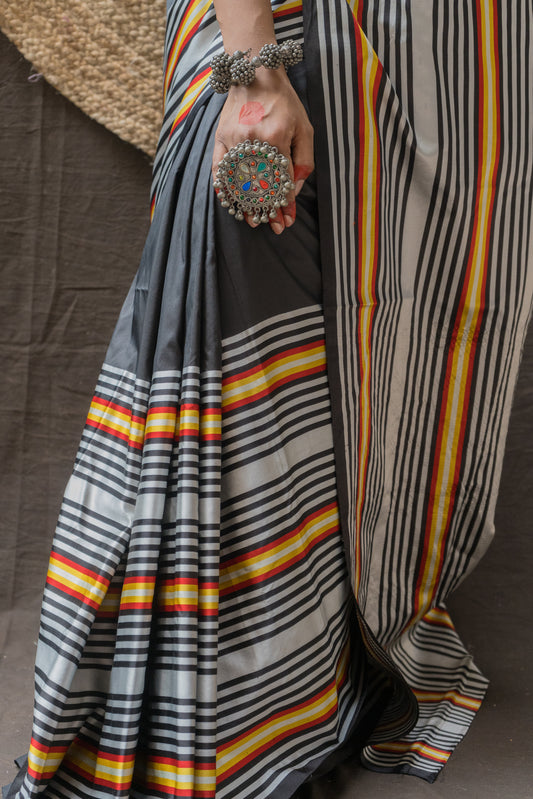 Chanderi Floral Printed Zari Stripes (Black) Saree