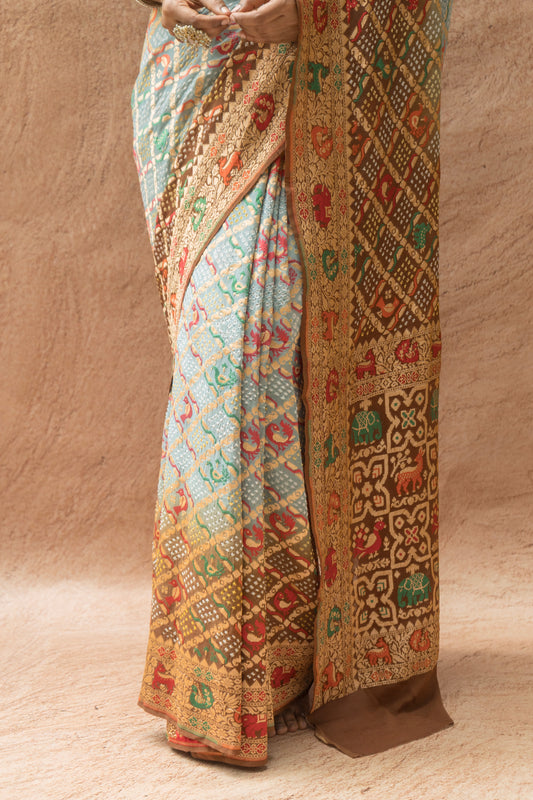 Georgette Patola Weaving Ombre Blue-Green-Brown Bandhej Saree