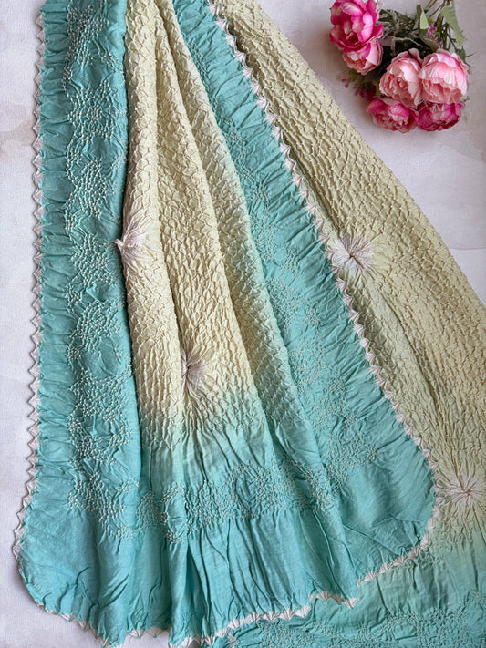 Lucknowi Georgette Ombre Blue-Green Bandhej Saree