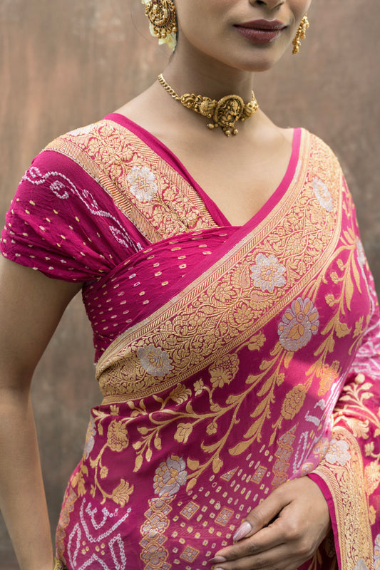 Georgette Sona Rupa Stripes Ombre Onion Pink-Purple Bandhej Saree