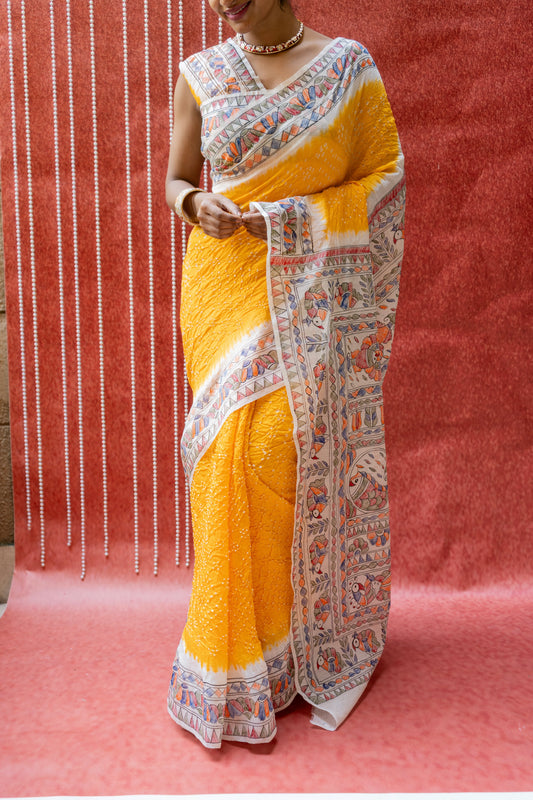 Gajji Ajrakh Rai Dana Mustard Yellow Bandhej Saree