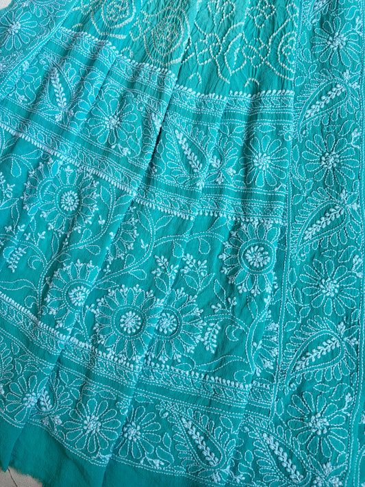 Lucknowi Georgette Bandhej Sea Green Sky Blue Ombre Dupatta