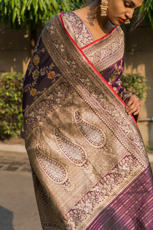 You should notice the subtle sheen from the metallic threads of zari which is woven into a crisp soft drape, satin like texture. Most authentic Banarasi tissue silk sarees showcase the use of traditional patterns and assure its quality with quality marks.