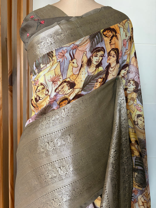 Tussar Katha Zig-Zag Bluish Grey Saree