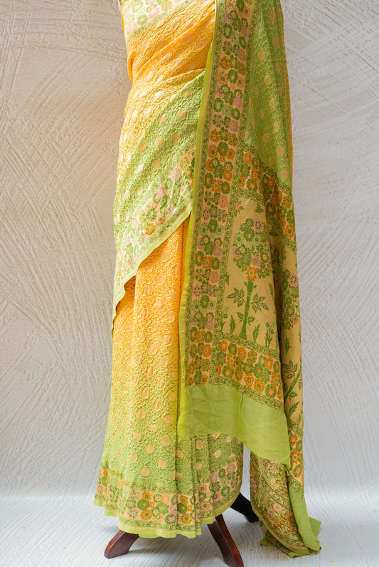 Green Shaded Bandhani with Floral Border Saree