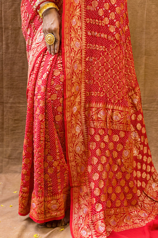 Multi Weaving Red Rai Dana Sona Rupa Bandhej Saree