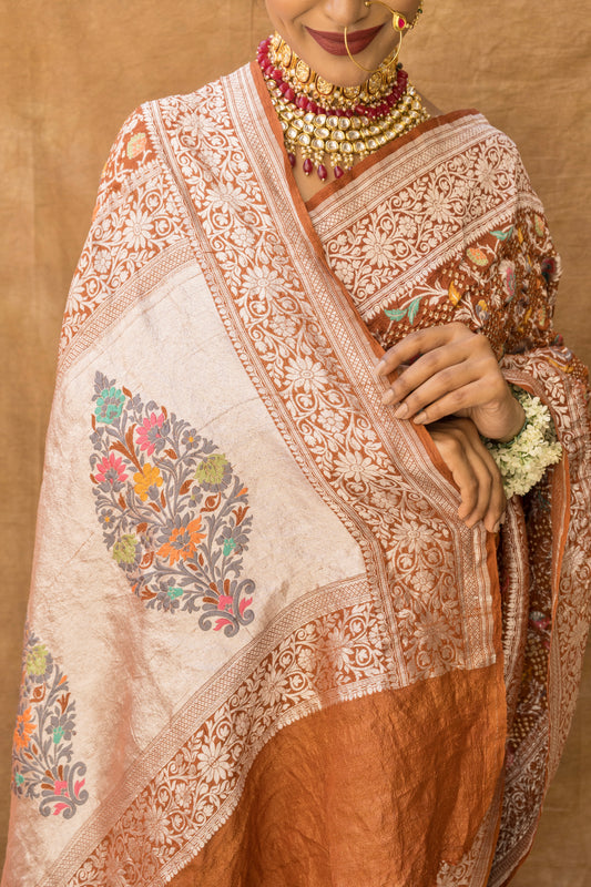 Meenakari Jaal Bandhej with Paithani Palla Brown Saree