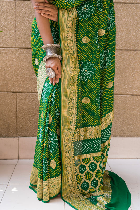 Bandhej Intricate Bottle Green Saree