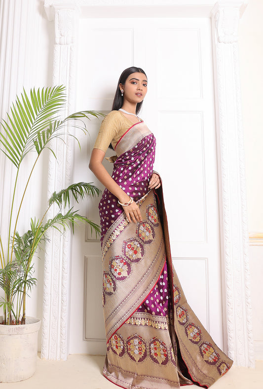 Purple Booti Silver Gold Saree
