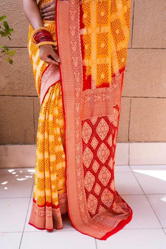 Georgette Lucknowi Yellow-Orange Bandhej Saree