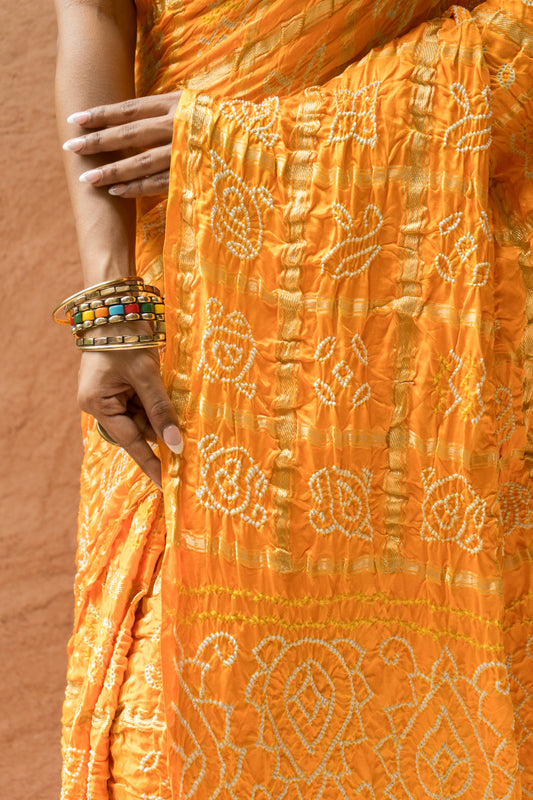 Ombre Yellow-Orange Satin Silk Kadhua Border Bandhej Saree