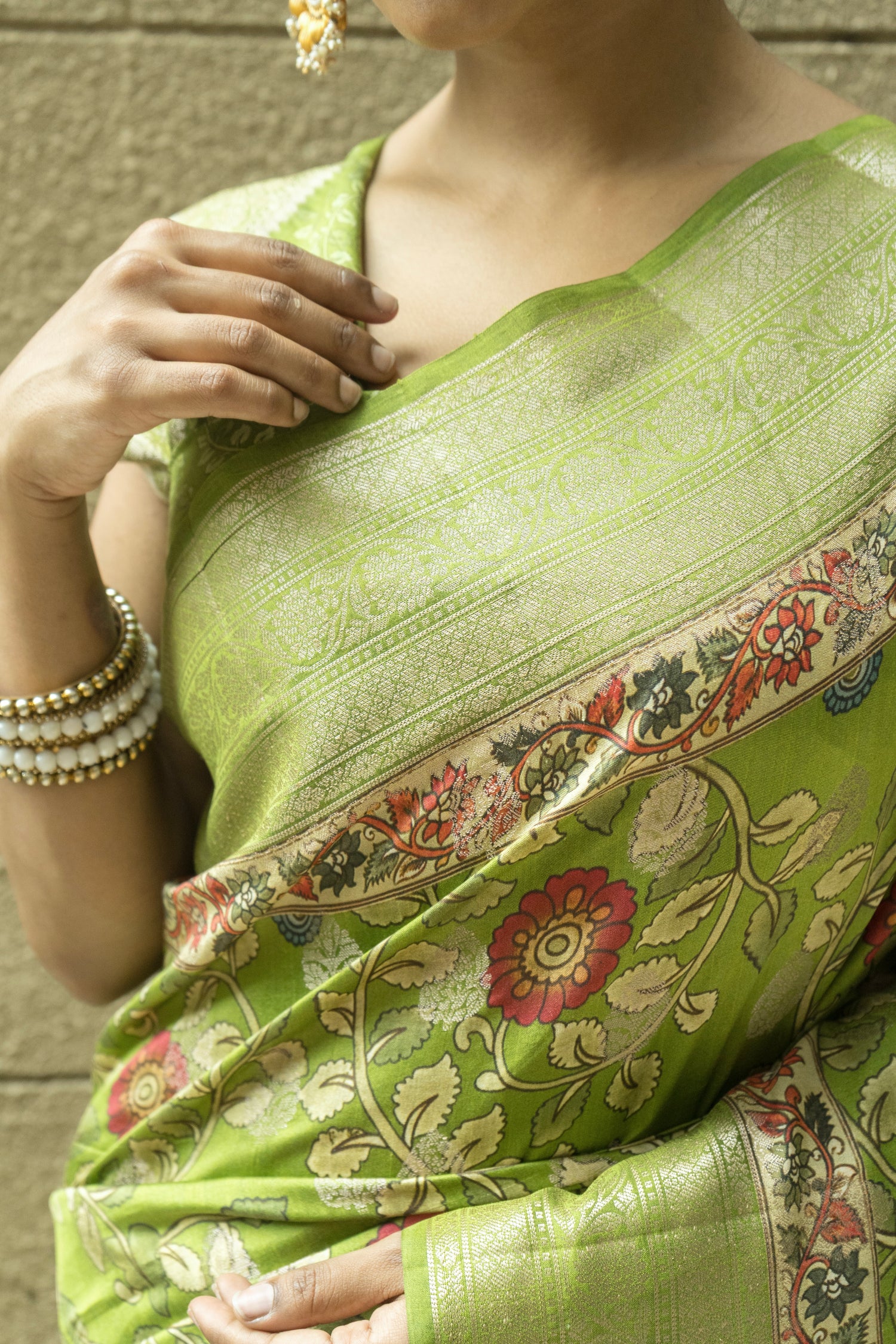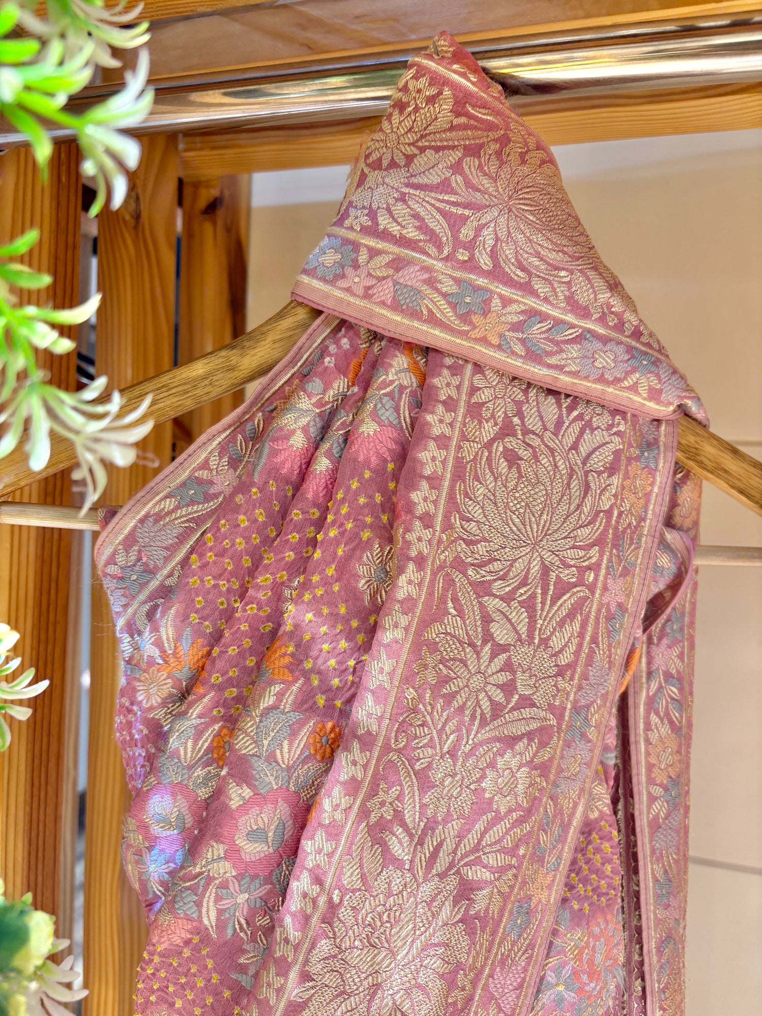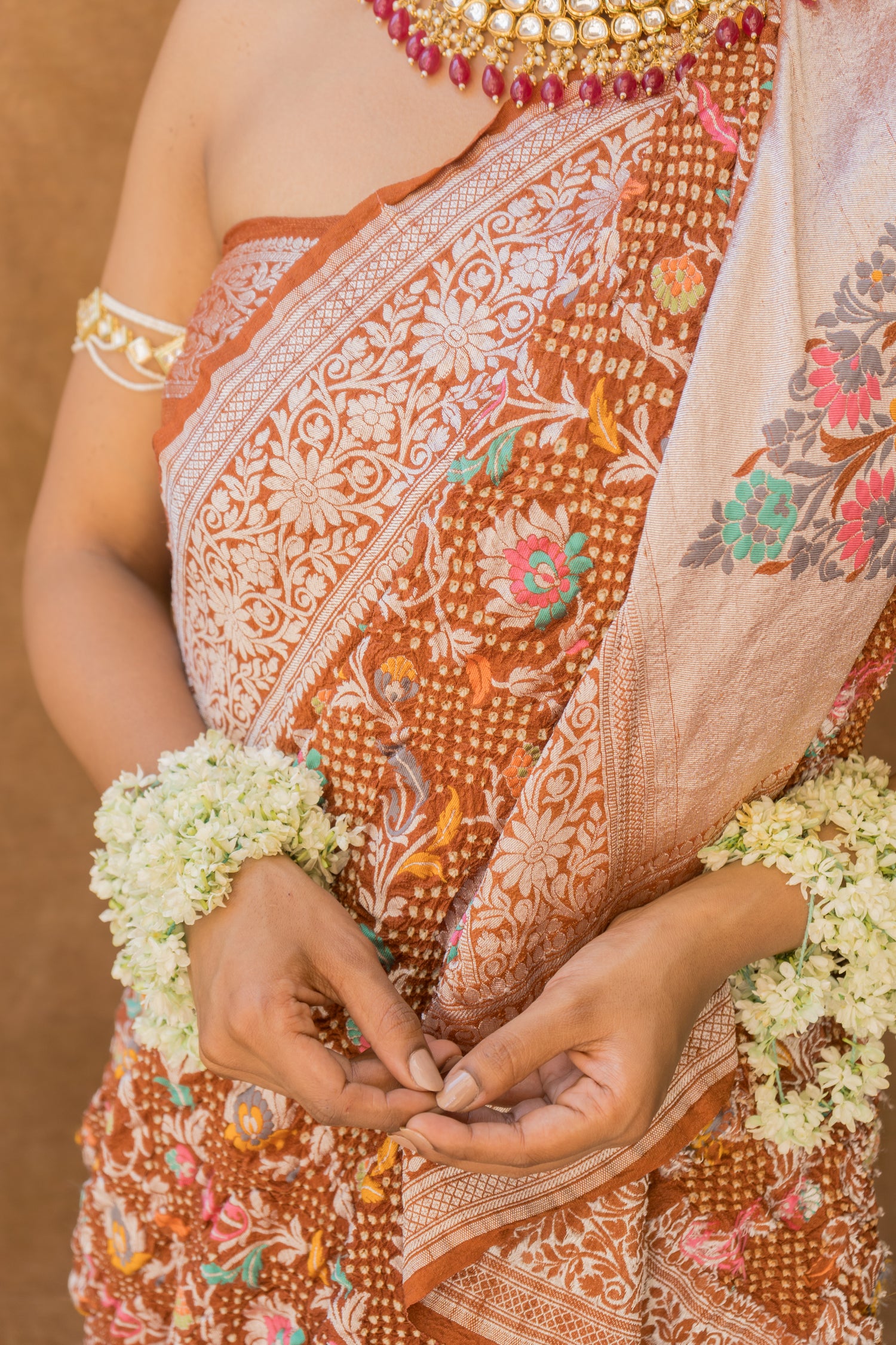 Explore handcrafted Rai Dana Bandhej sarees with Banarasi elegance. Need help choosing...