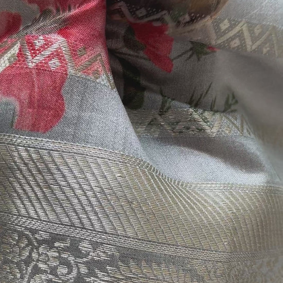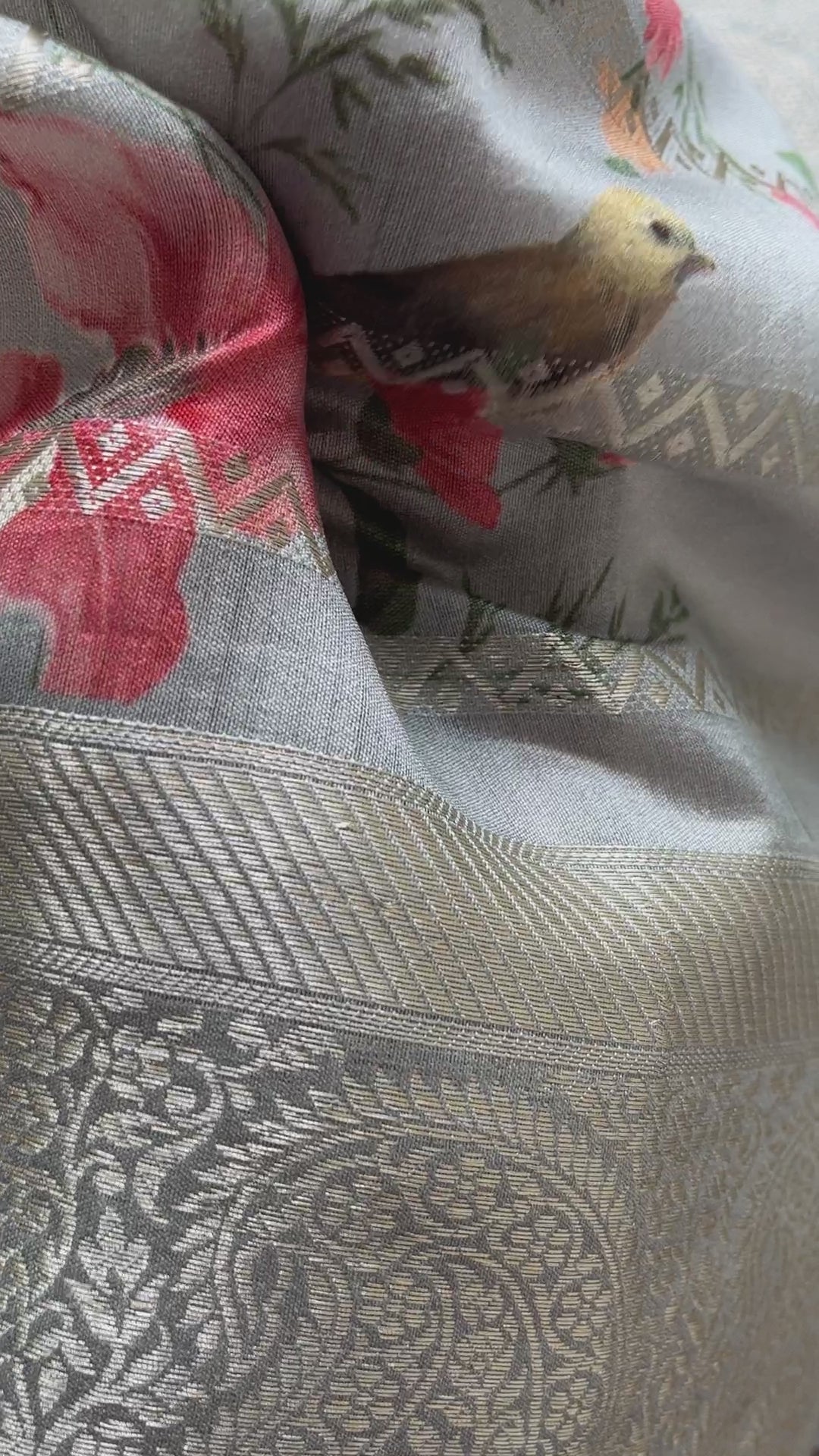 Our Pure Banarasi Chiniya Silk saree, an artistic tradition and a classy masterpiece. Zari stripes has been weaved upon colourful floral and bird print coming with patterned zari border. Patterned zari jaal weaving done upon palla. Get it with printed running blouse piece having zari border and zari boota spread upon the print.