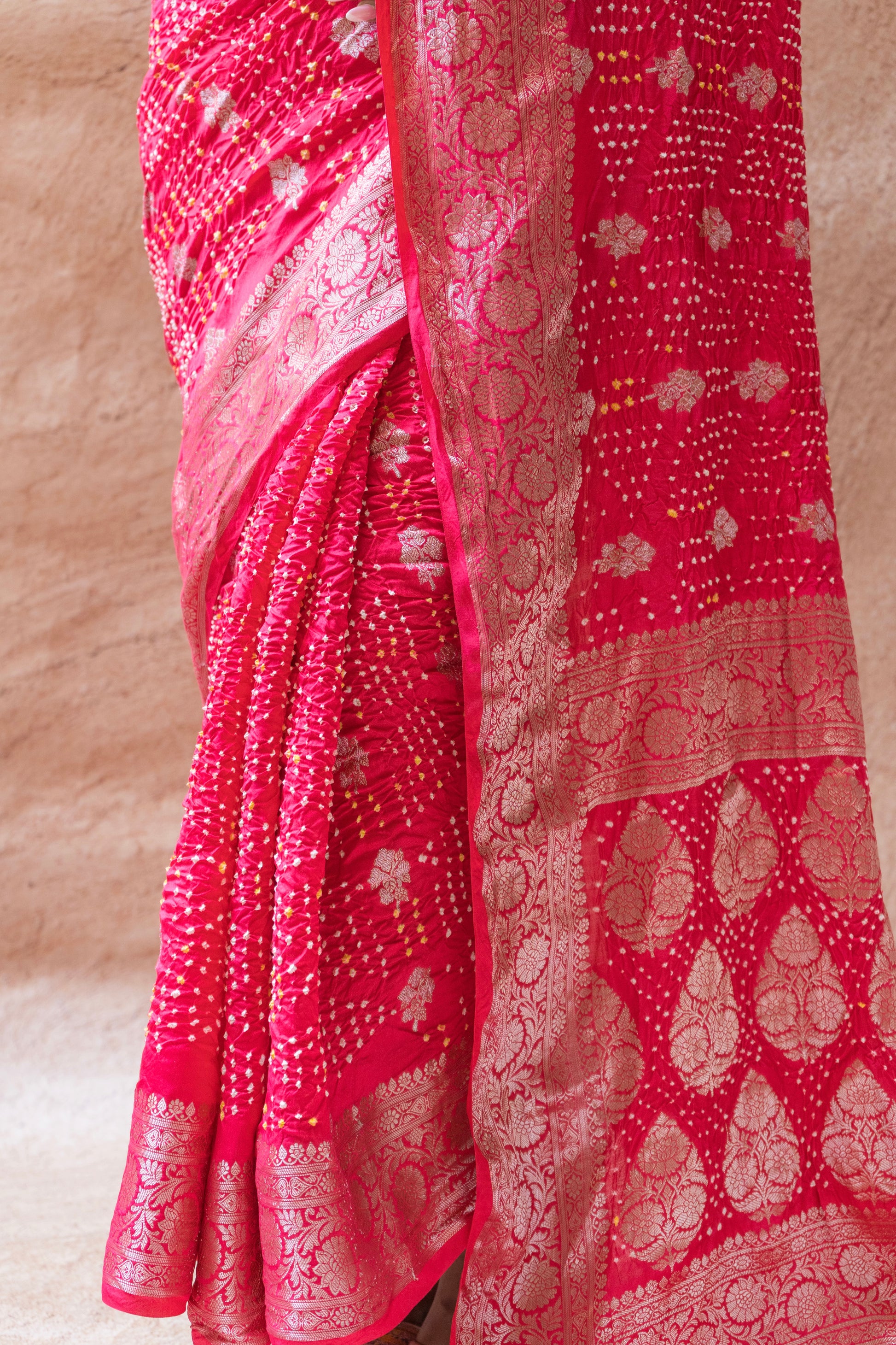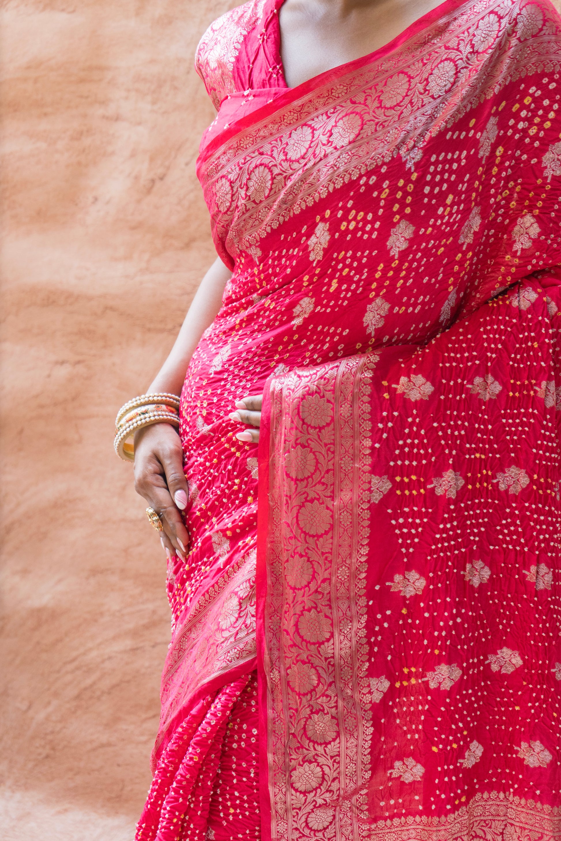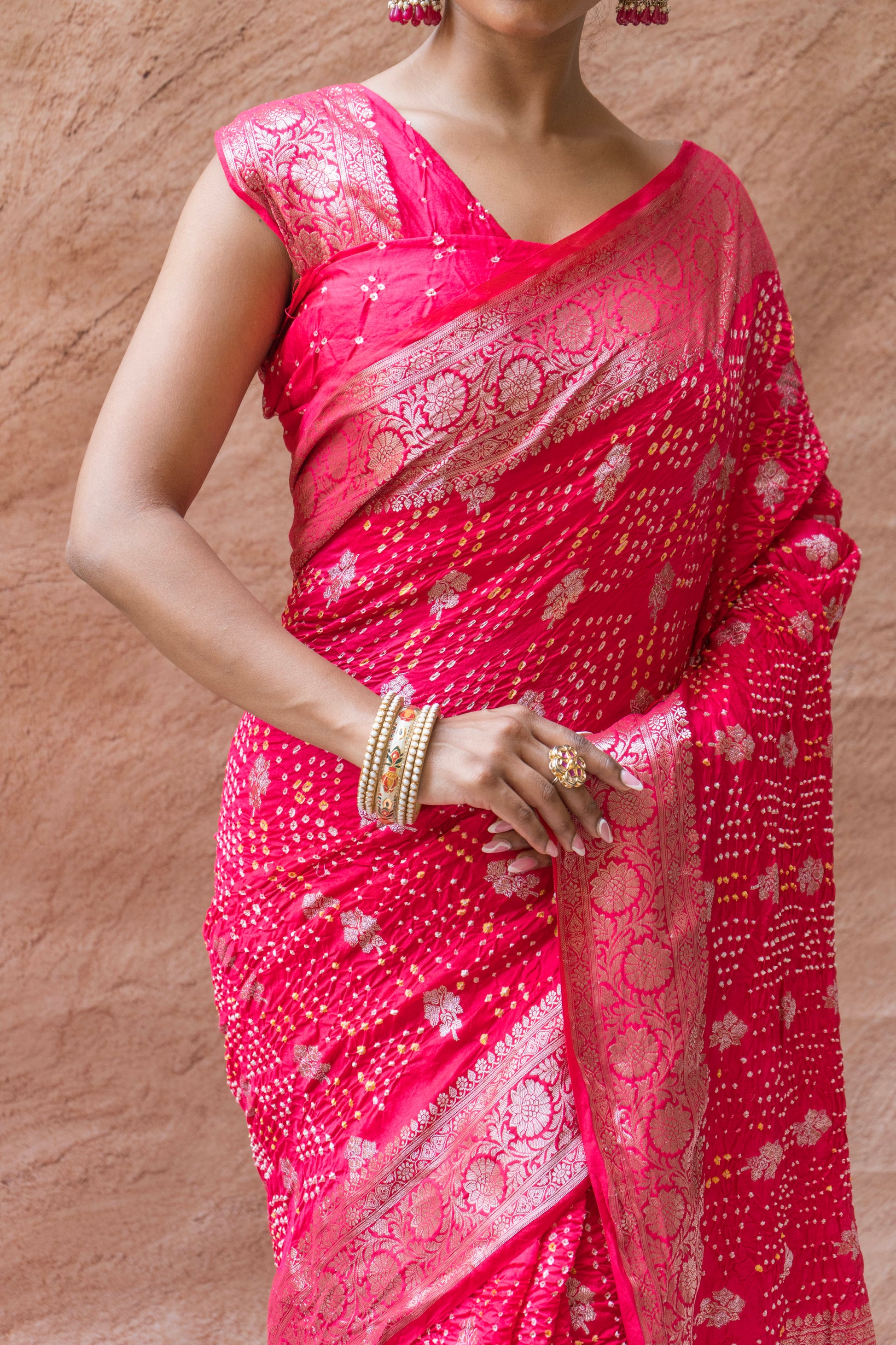 The saree also features hand-done bandhej, adding a touch of fine craftsmanship and charm. It’s light in weight, easy to drape, and perfect for long hours of wear.