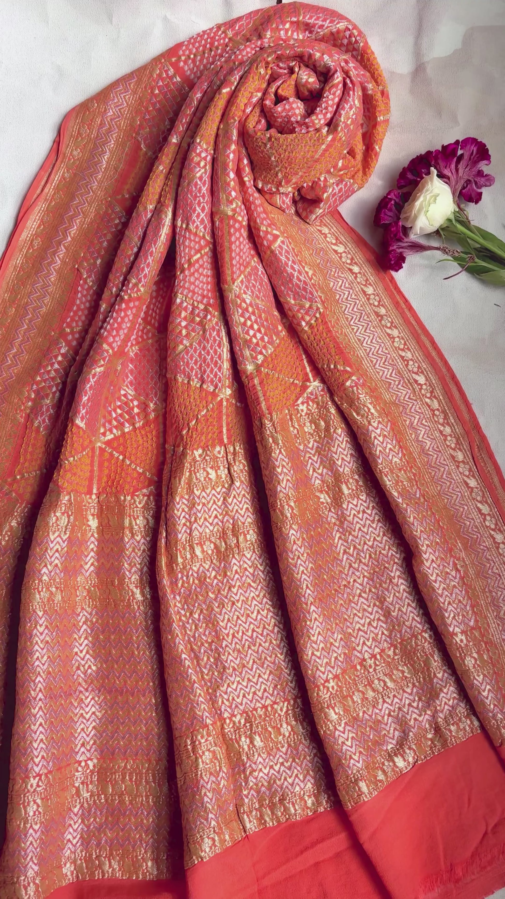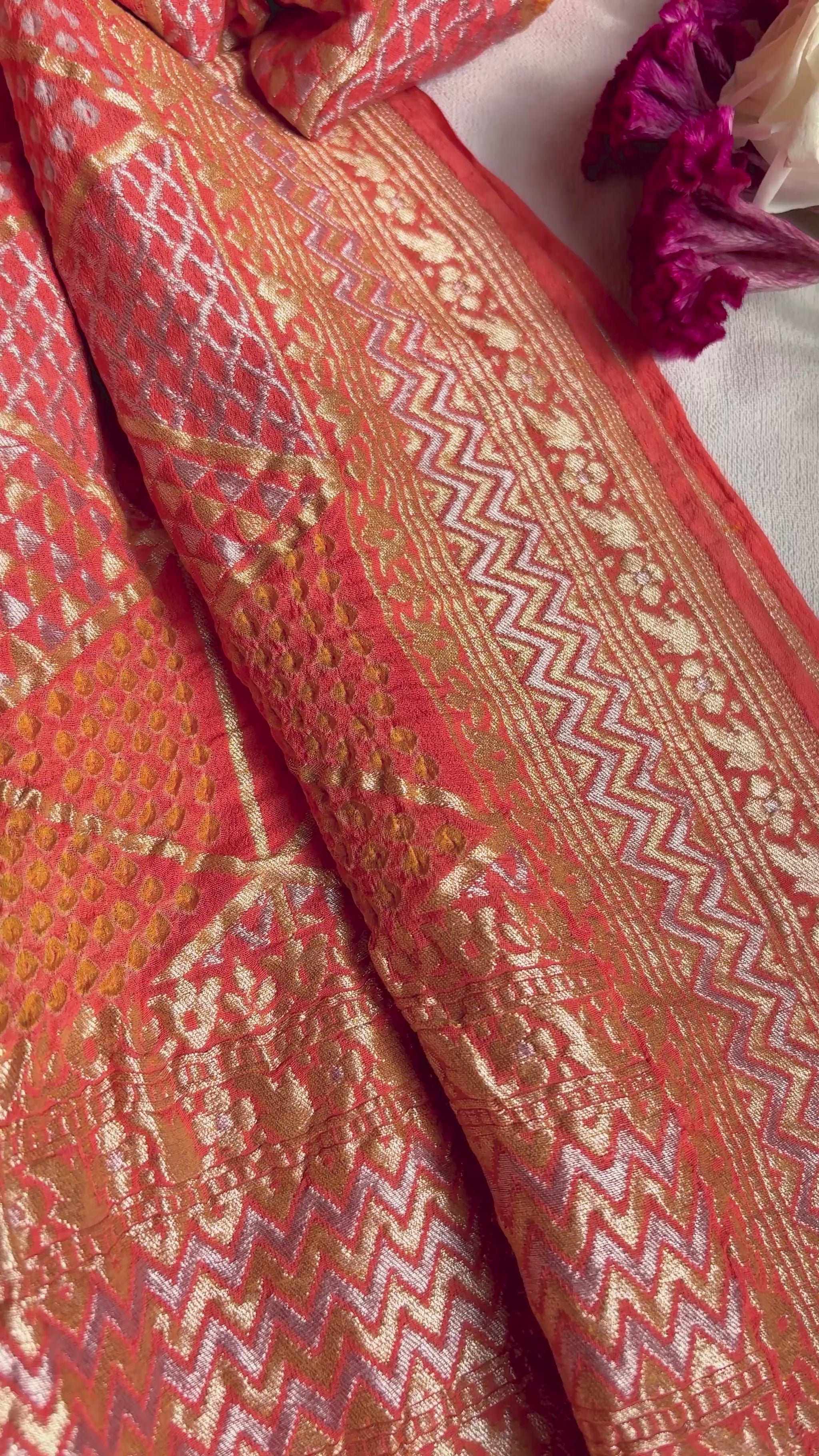 The airy, lightweight georgette fabric ensures a graceful fall, while the abstract pattern is highlighted with intricate rai dana bandhej, adding texture and depth.
