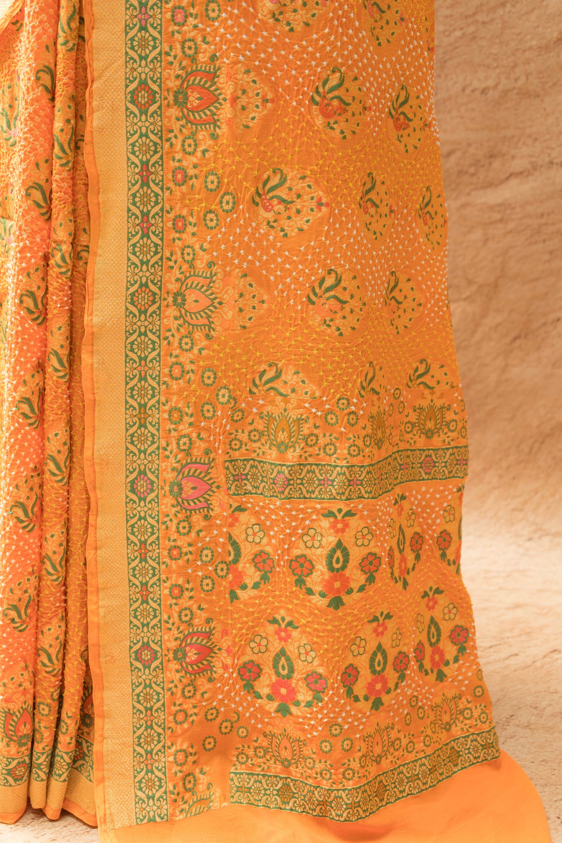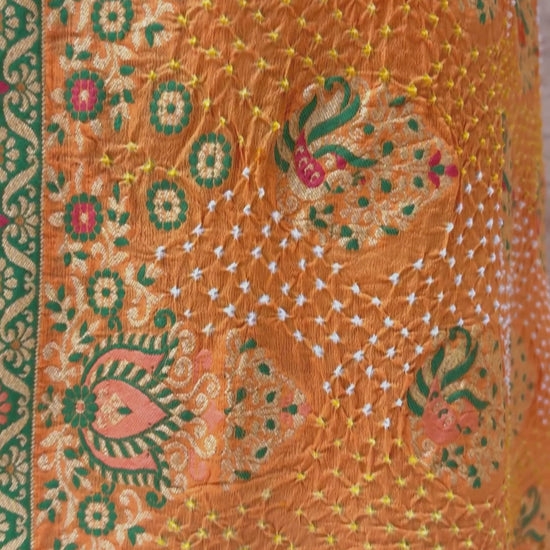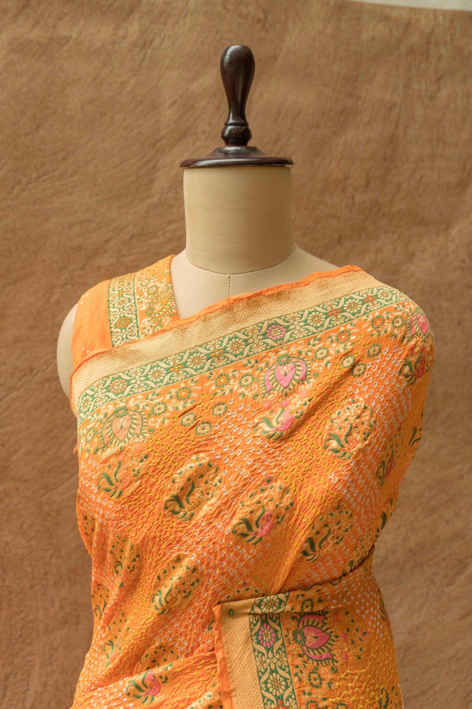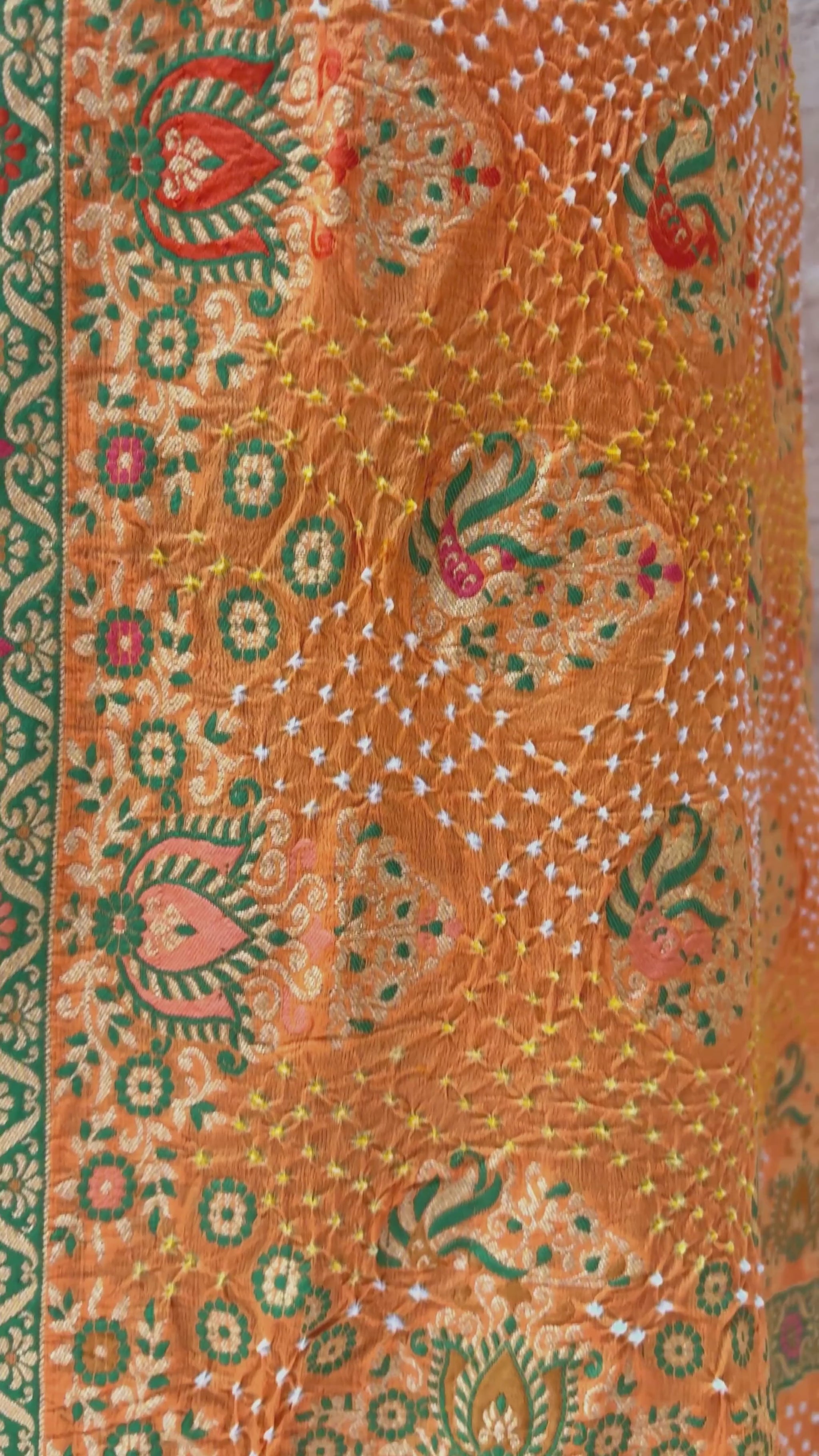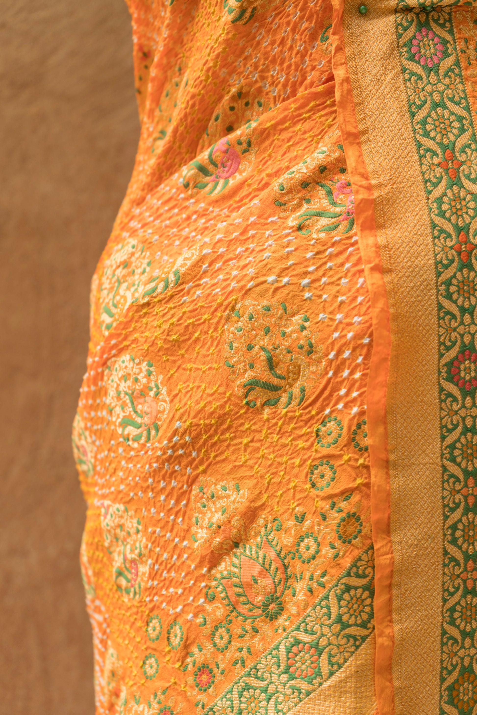 It features the traditional Rai Dana Bandhej technique, creating delicate dotted patterns all over. The saree is further adorned with Meenakari woven bootas, adding richness and intricate detail to its look.
