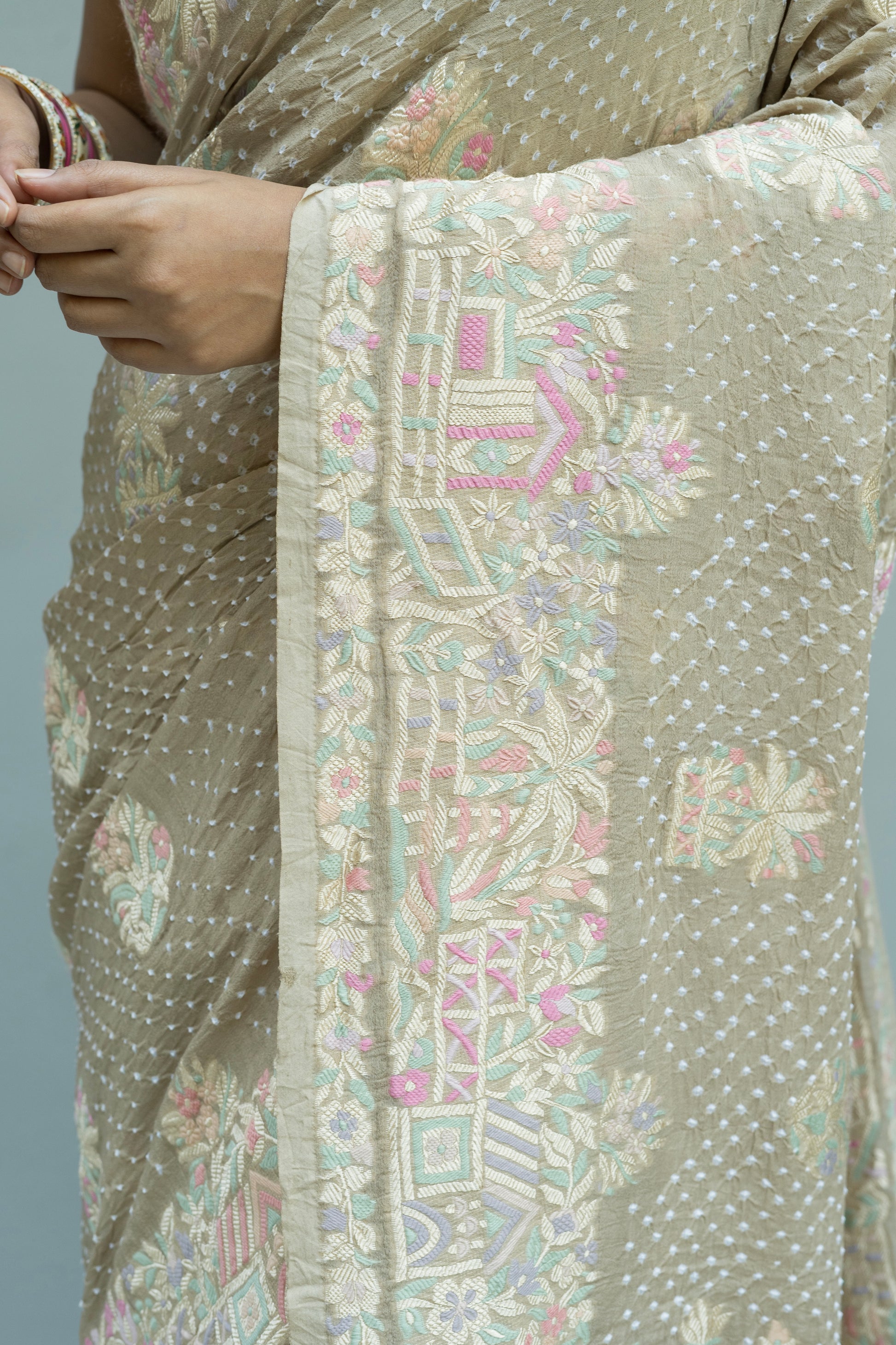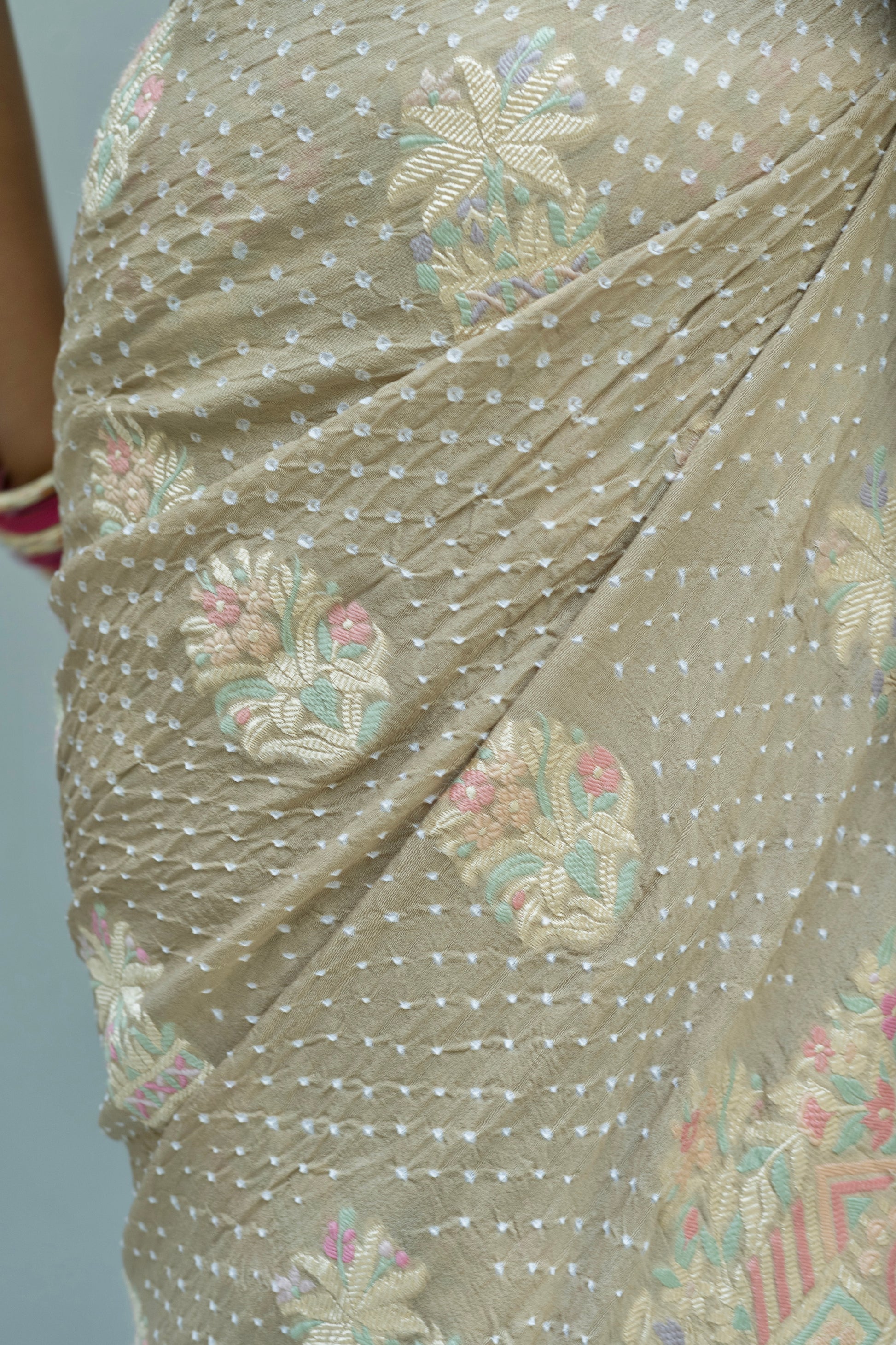 Georgette Parsi Bootidar Earthy Brown Bandhej Saree
