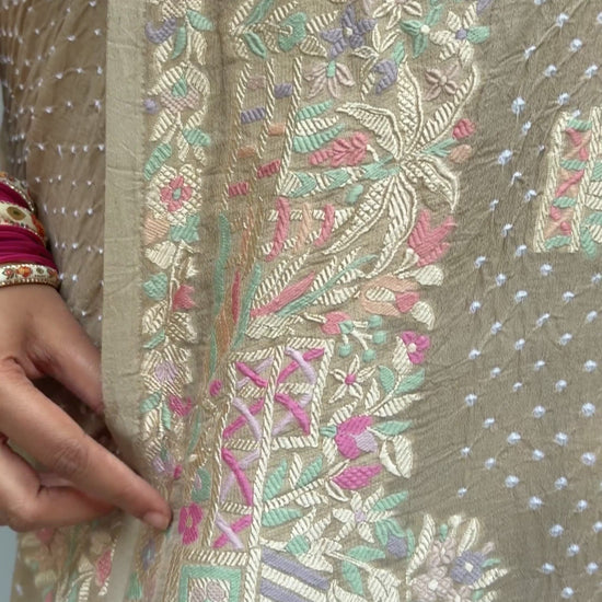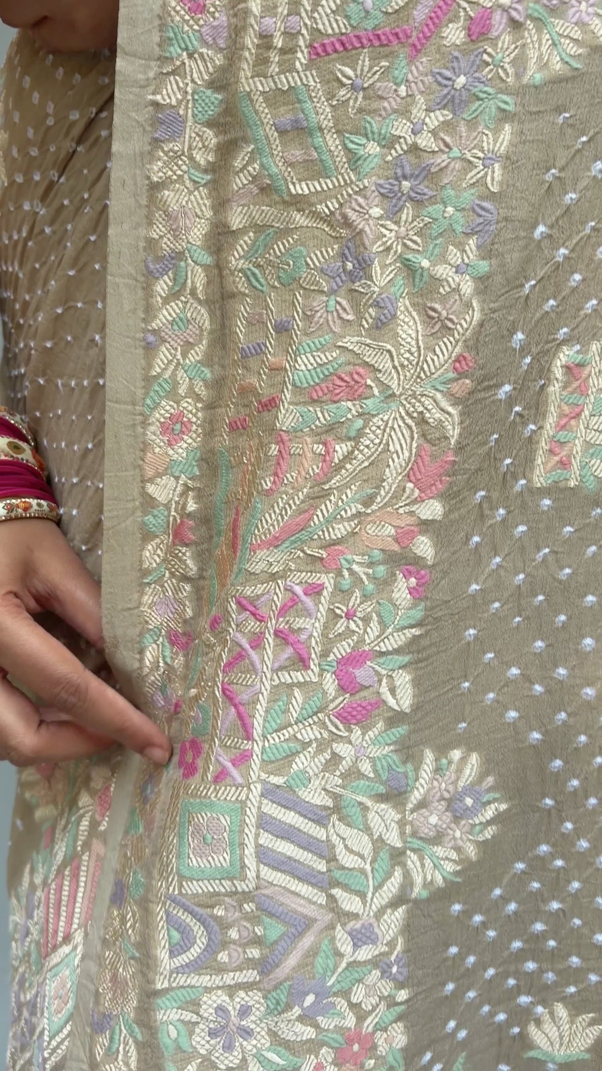 The soft earthy brown base is beautifully dotted with delicate rai dana work and highlighted with pastel Parsi embroidery, creating a dreamy and soothing colour story.