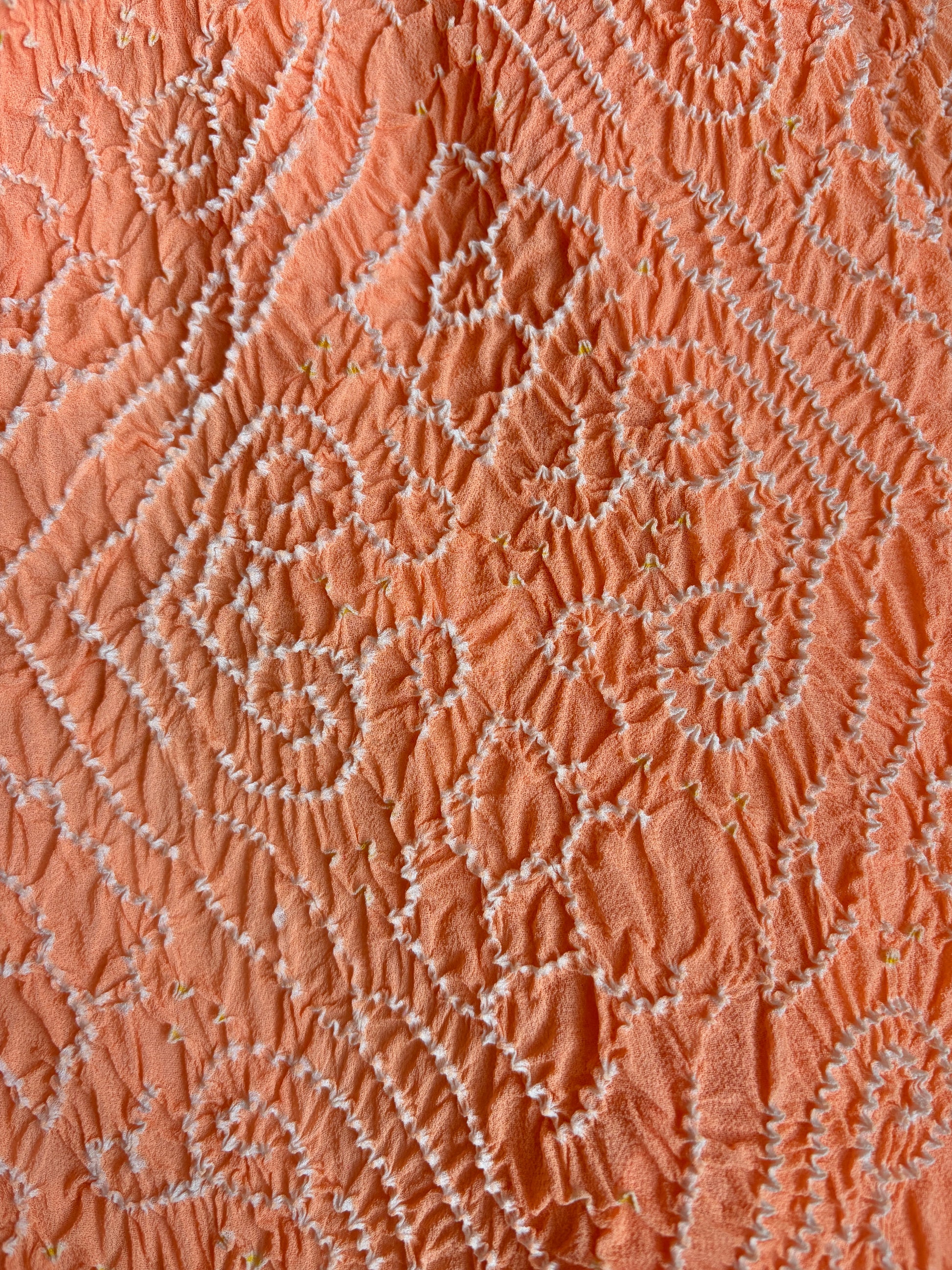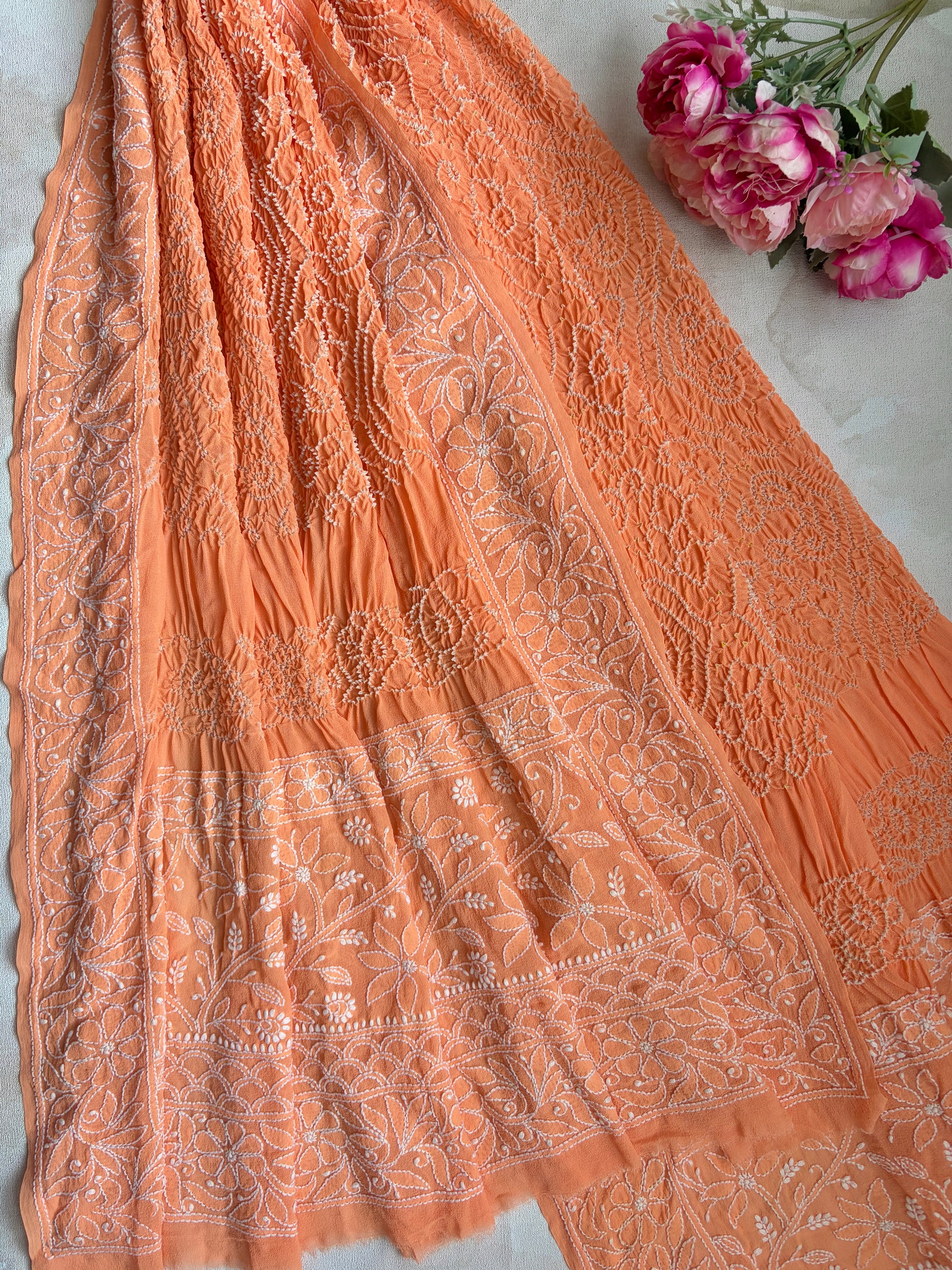 Soft, elegant, and timeless, this Georgette Peach Lucknowi Bandhej Dupatta is a beautiful expression of fine craftsmanship.
