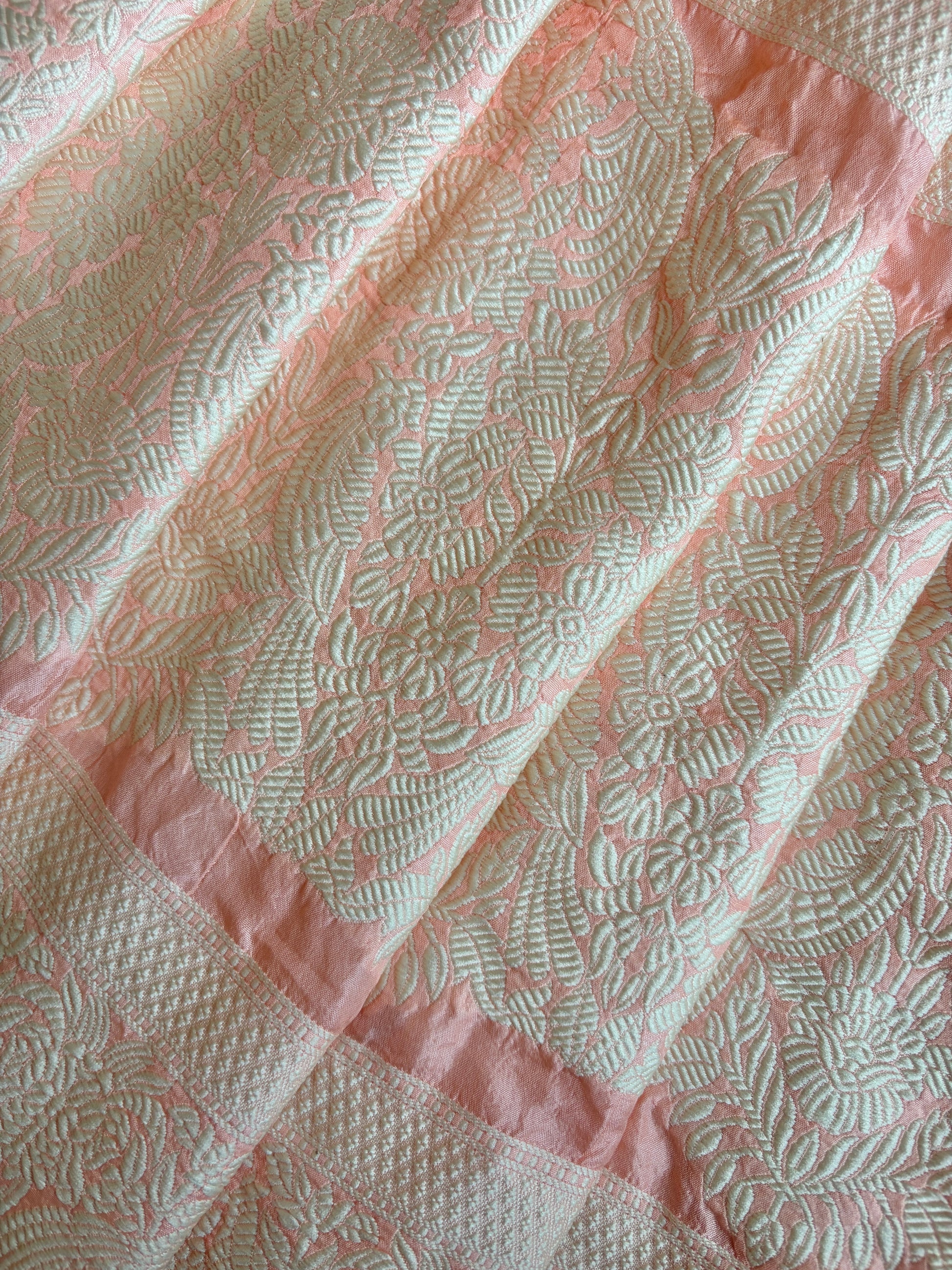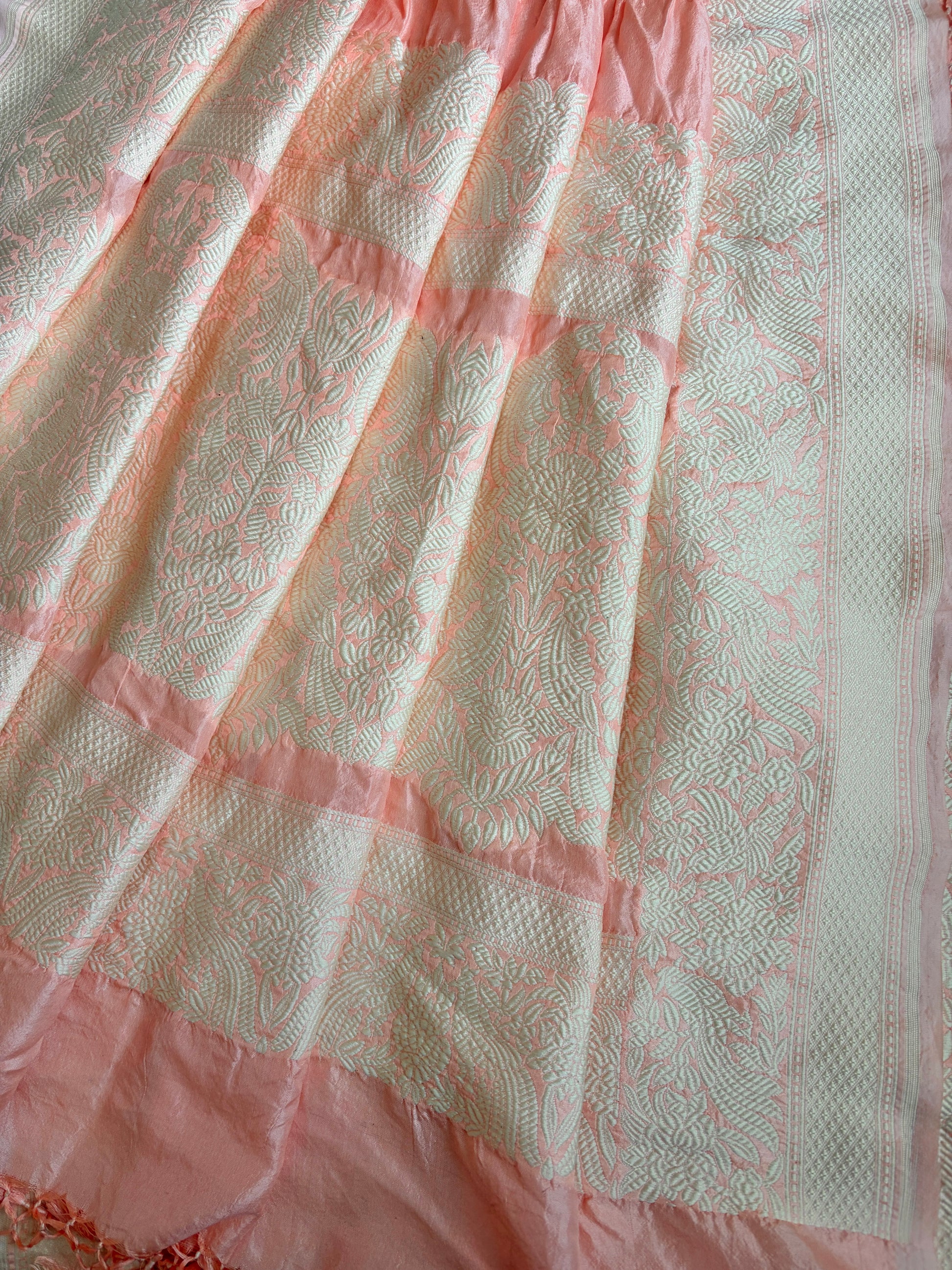 A vision in grace and craftsmanship — this Katan Parsi Rai Dana Dupatta in soft pastel pink exudes understated luxury.