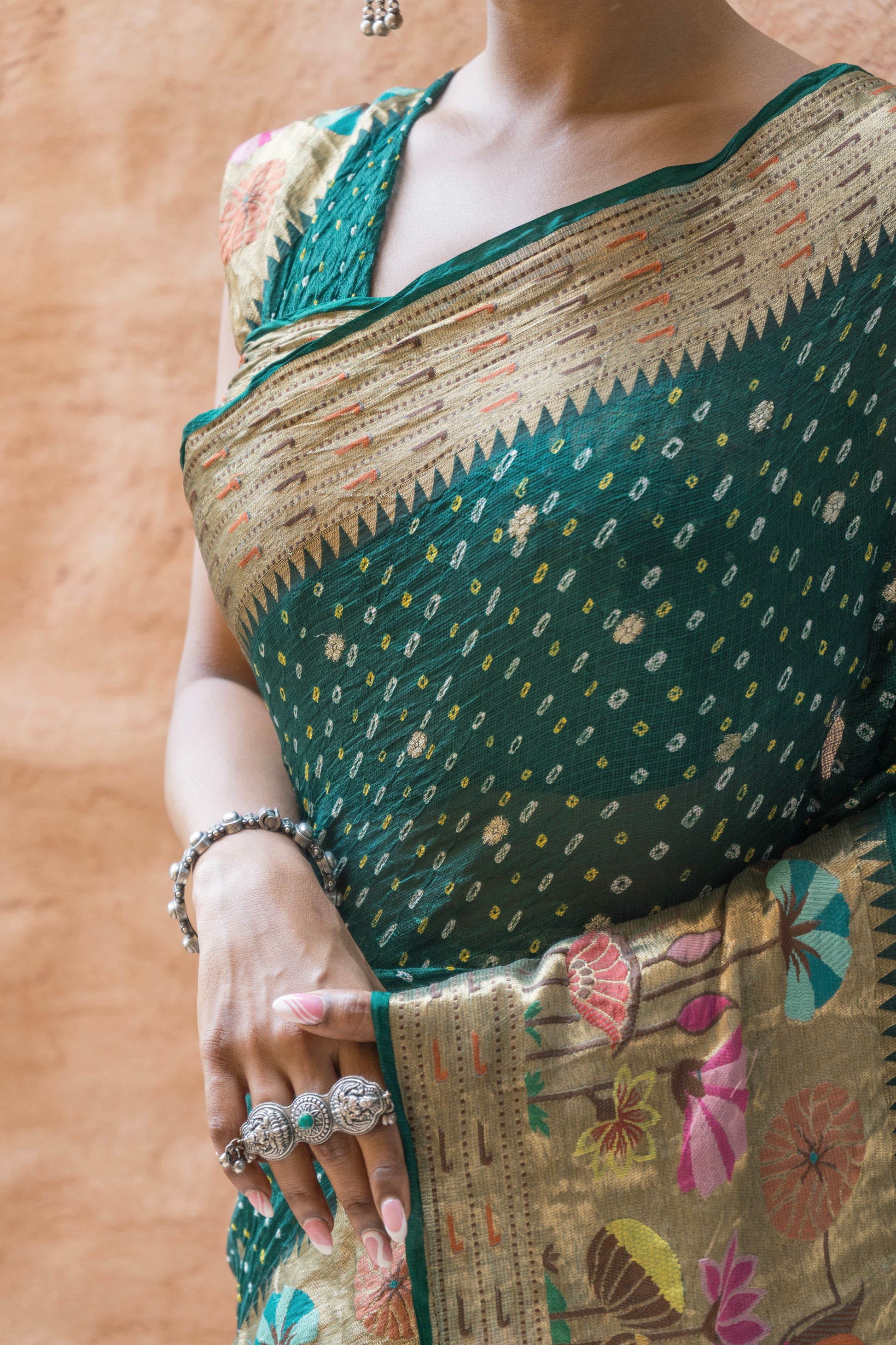 Kota Doria Meenakari Bandhej Bottle Green Saree