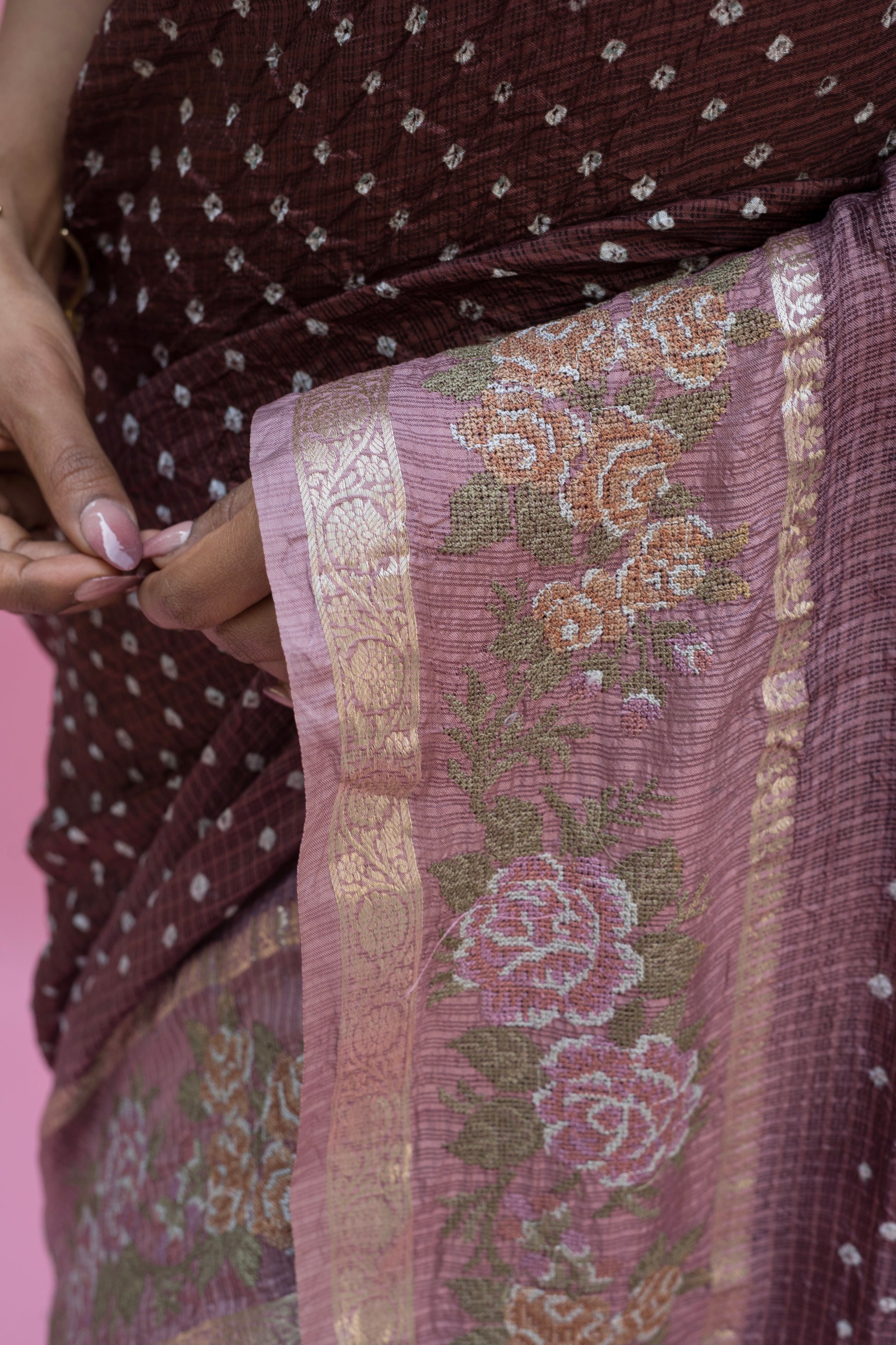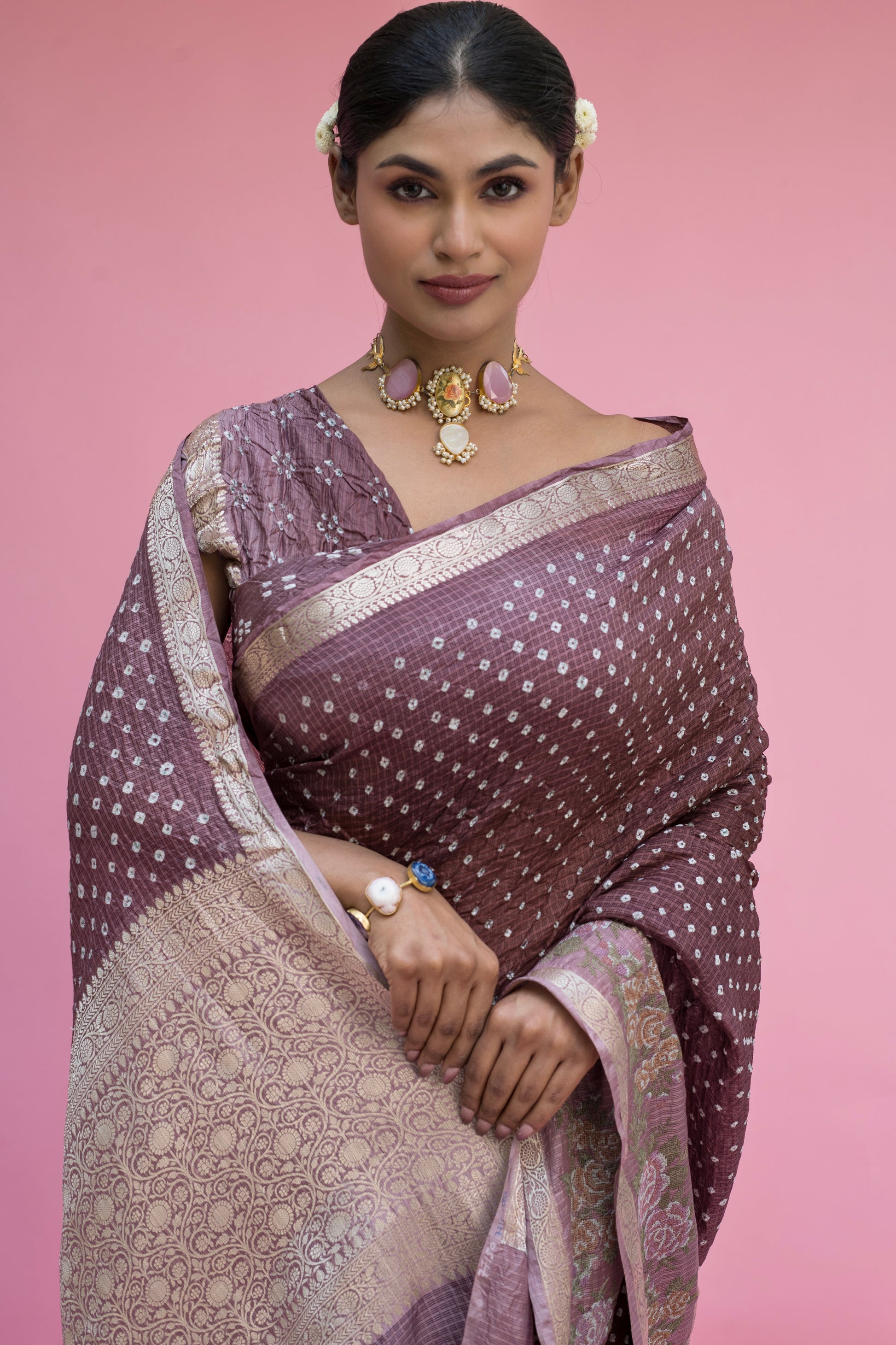 Kota Shaded Mauve-Brown Embroidered Bandhej Saree